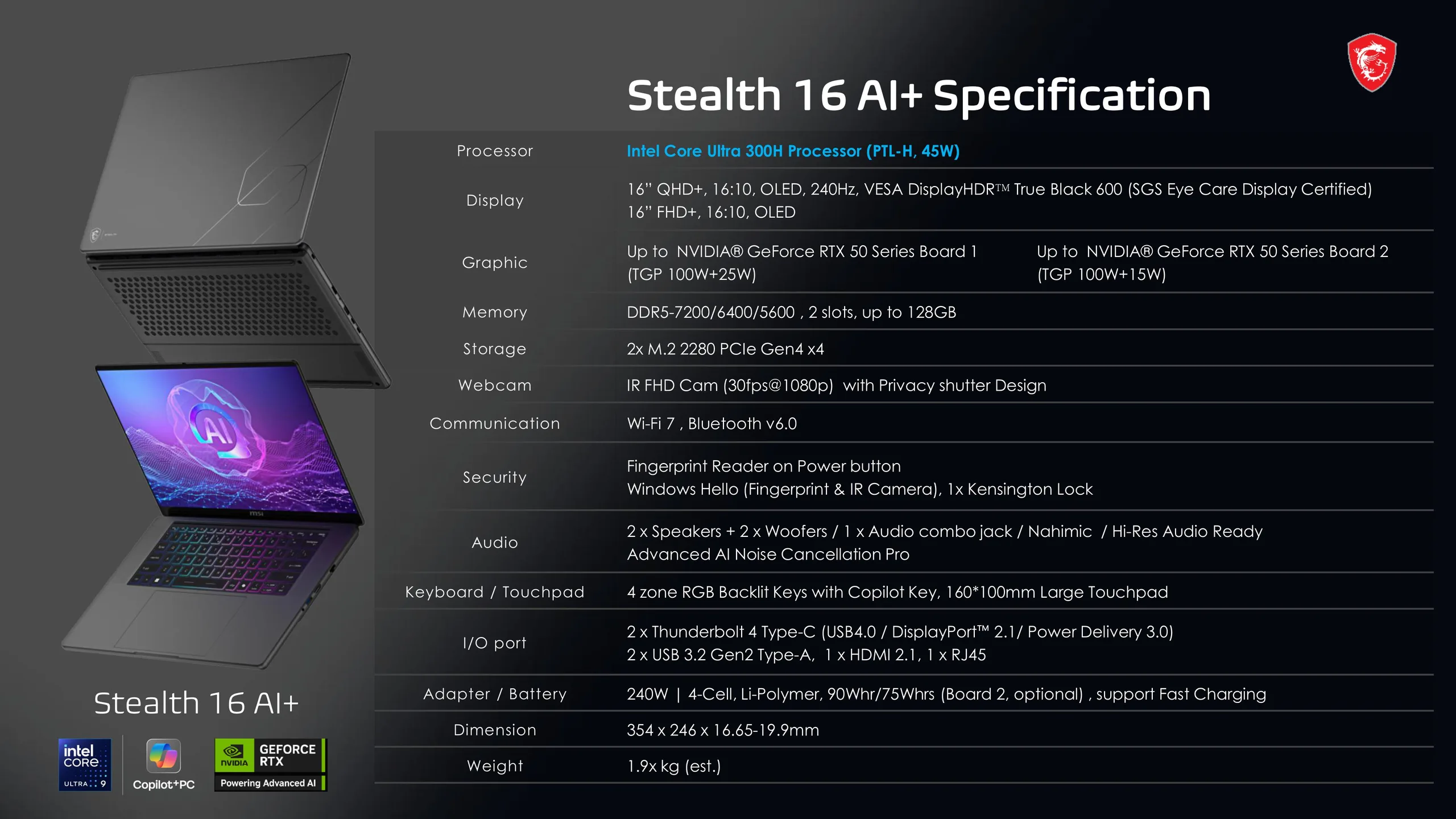 Os compradores podem configurar o Stealth 16 AI+ com até 128 GB de RAM DDR5-5600/6400/7200 e duas unidades M.2 NVMe PCIe Gen 4. Também estão disponíveis uma webcam IR FHD com obturador de privacidade, além de um leitor de impressões digitais no botão de energia, Wi-Fi 7, Bluetooth 6, uma configuração de quatro alto-falantes e um teclado RGB de quatro zonas com um touchpad de 160 x 100 mm.
