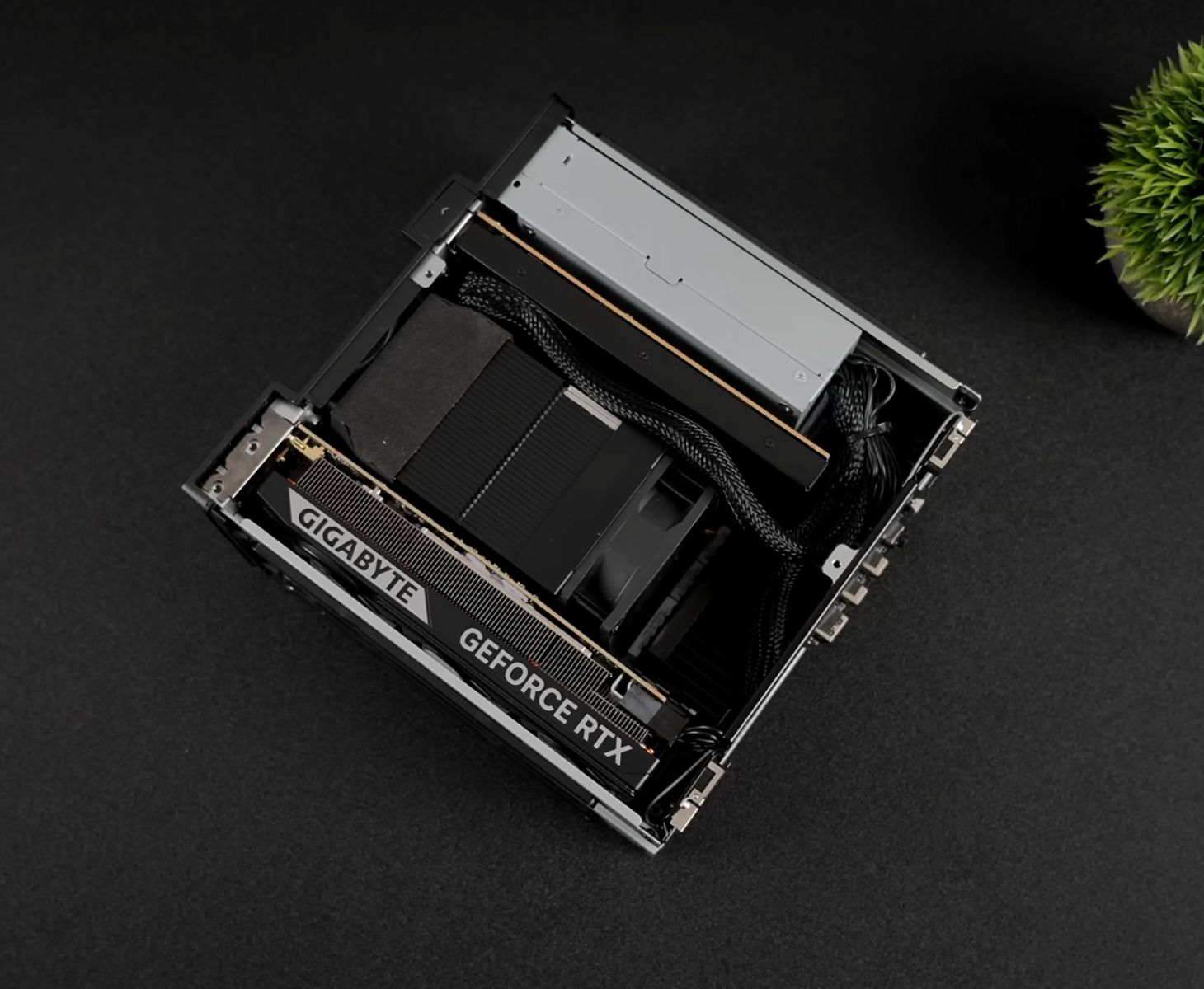 O senhor começa o vídeo com uma desmontagem do MS-02 Ultra, que, segundo ele, é surpreendentemente fácil, pois a remoção de apenas dois parafusos permite que a estrutura interna deslize para fora. No interior, o cooler da CPU e a PSU de 350 W ocupam a maior parte do espaço, deixando apenas espaço suficiente para uma GPU de baixo perfil e, como visto na imagem acima, a RTX 5060 LP se encaixa muito bem.