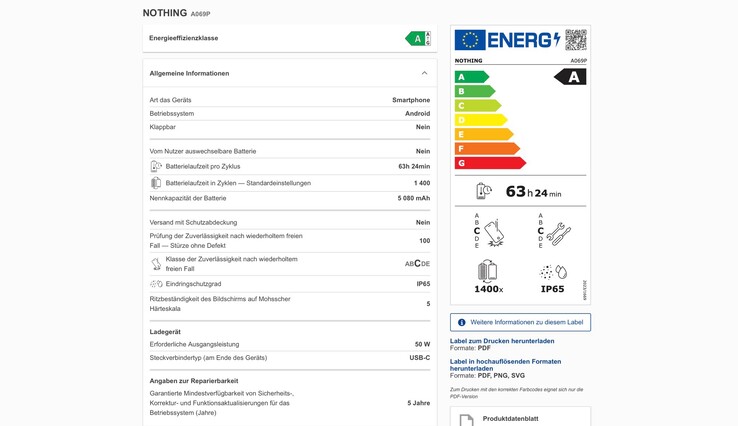 De acordo com a listagem, a capacidade da bateria aumentará apenas ligeiramente de 5.000 mAh para 5.080 mAh, e o carregamento continuará sendo feito via USB-C com até 50 watts. Com base nos critérios de teste menos rigorosos da etiqueta de energia da UE, a duração da bateria deve ser de mais de 63 horas. Espera-se que a bateria dure 1.400 ciclos de carga antes que sua capacidade restante caia abaixo de 80%