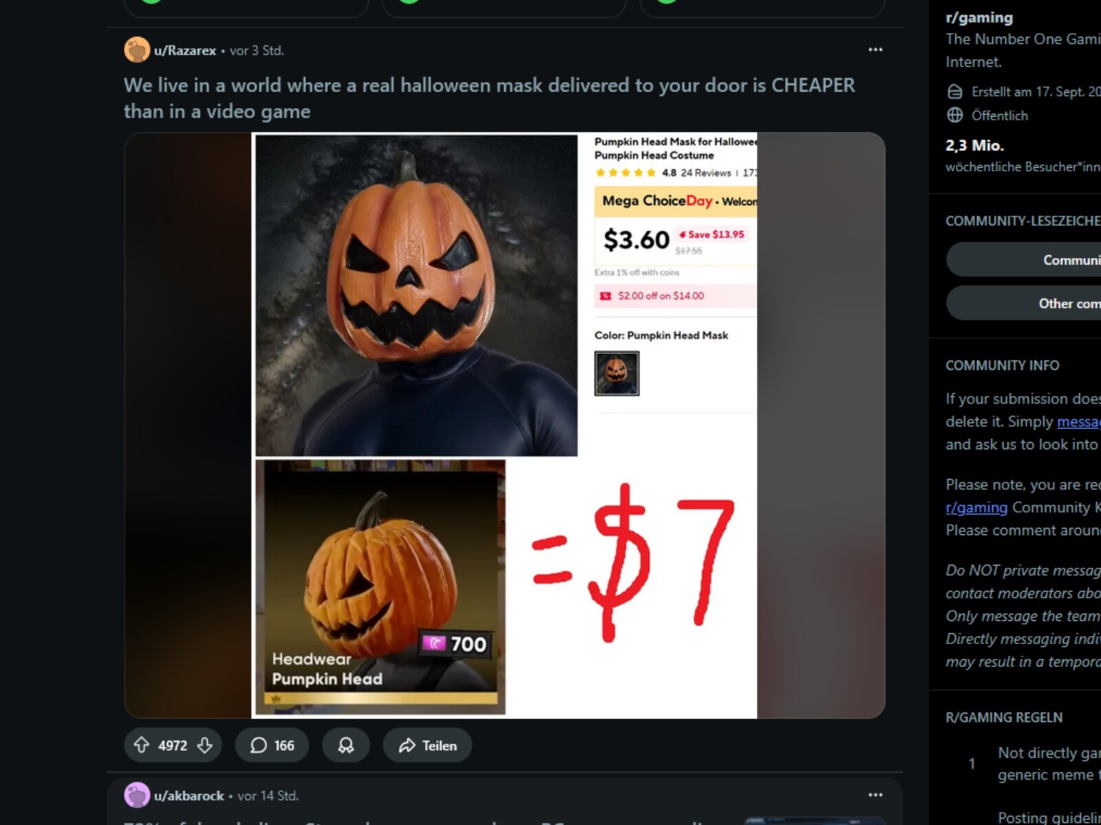 Em 4 de novembro, uma publicação no Reddit intitulada "Vivemos em um mundo em que uma máscara de Halloween real entregue em sua casa é mais barata do que uma de videogame" se tornou viral. A publicação apontou que uma máscara de cabeça de abóbora no Fortnite custa duas vezes mais do que uma versão semelhante na vida real. A impressionante diferença de preços rapidamente chamou a atenção, gerando cerca de 5.500 comentários em apenas três horas.