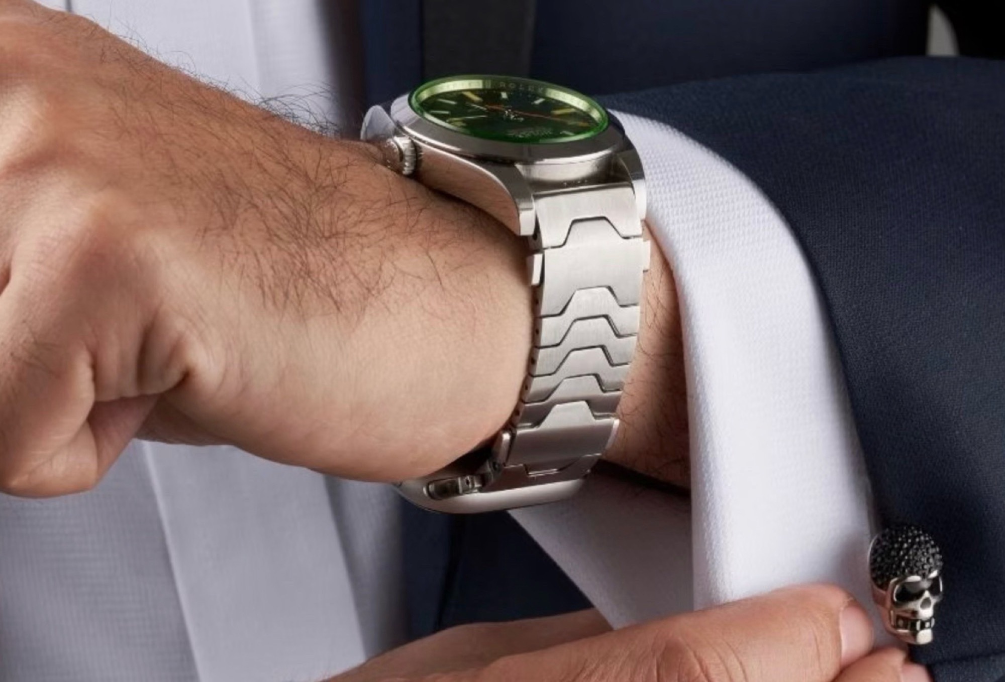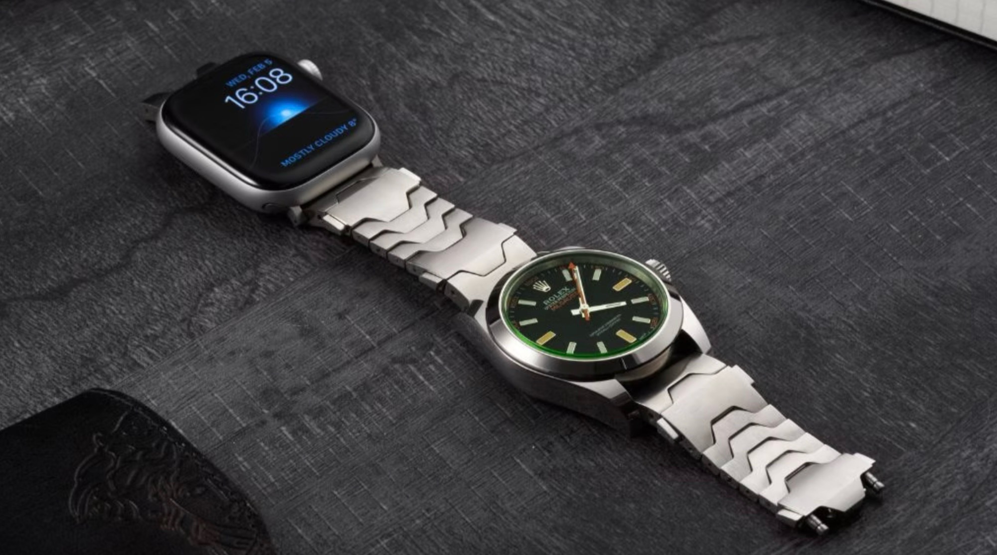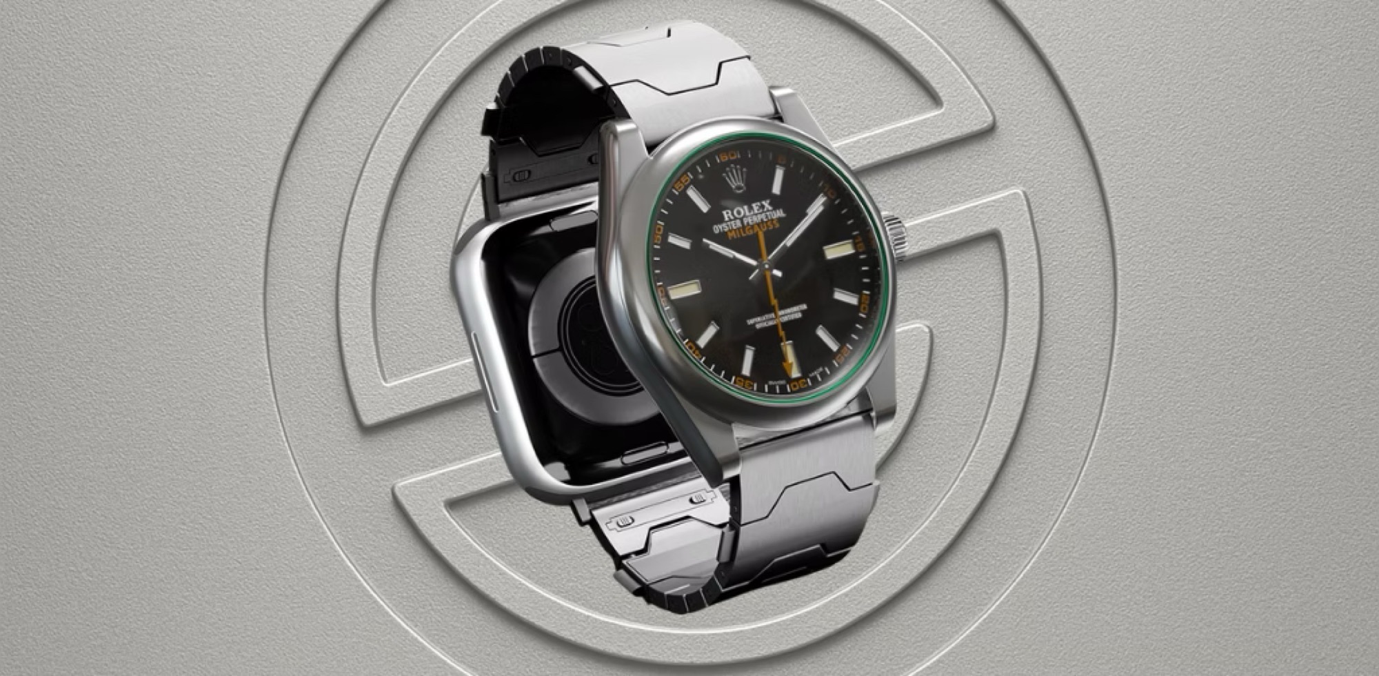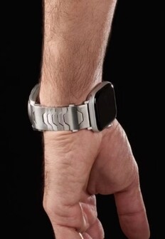 A pulseira está disponível em três versões: aço inoxidável em prata ou preto, ou titânio em cinza. Um fecho de liberação rápida pouco visível no elo superior permite que a pulseira seja aberta com um único movimento. O comprimento pode ser ajustado removendo-se ou adicionando-se elos com a ferramenta incluída. Pesando entre 60 e 100 gramas, dependendo do material e do comprimento, a pulseira é bastante pesada e o peso aumenta ainda mais quando dois relógios são acoplados. O segundo relógio pode ser substituído por um fecho convencional, se o senhor desejar