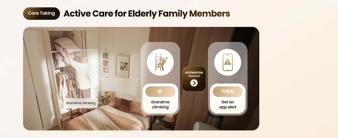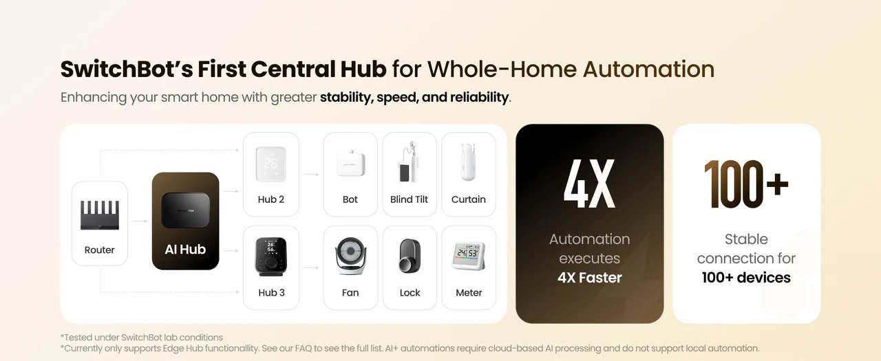 De acordo com o SwitchBot, vários recursos de IA estão disponíveis, incluindo reconhecimento de rosto, animal de estimação e objeto para feeds de câmera ao vivo. As automações locais de VLM também são suportadas e possibilitam o controle de um atuador dependendo de um objeto reconhecido. Por exemplo, o SwitchBot menciona a possibilidade de acender uma luz quando uma pessoa está deitada no sofá. Vários comportamentos podem ser reconhecidos e acionar rotinas inteligentes. O hub de casa inteligente é anunciado com um desempenho de IA de 6 TOPS.