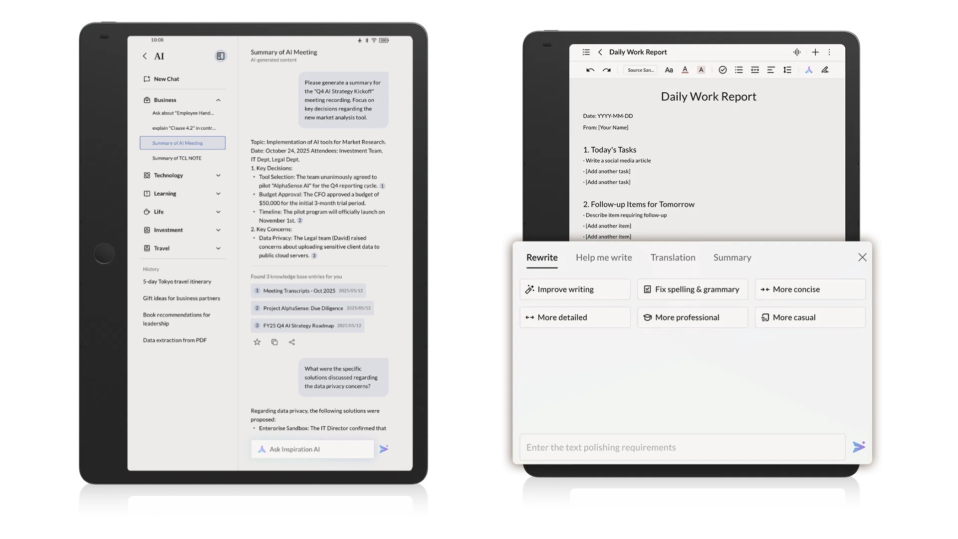 Embora a TCL não diga se o dispositivo é executado em Android, ela destaca alguns de seus recursos de software. O TCL Note A1 NxtPaper tem suporte para multitarefa em tela dividida e transmissão de tela sem fio. Ele vem com uma tonelada de recursos de IA, como transcrição de reuniões com IA, tradução em tempo real com IA e resumo com IA. Há também o Help Me Write, AI Rewrite, conversão de escrita manual em texto, reconhecimento de fórmulas e uma tela infinita para artistas e designers.