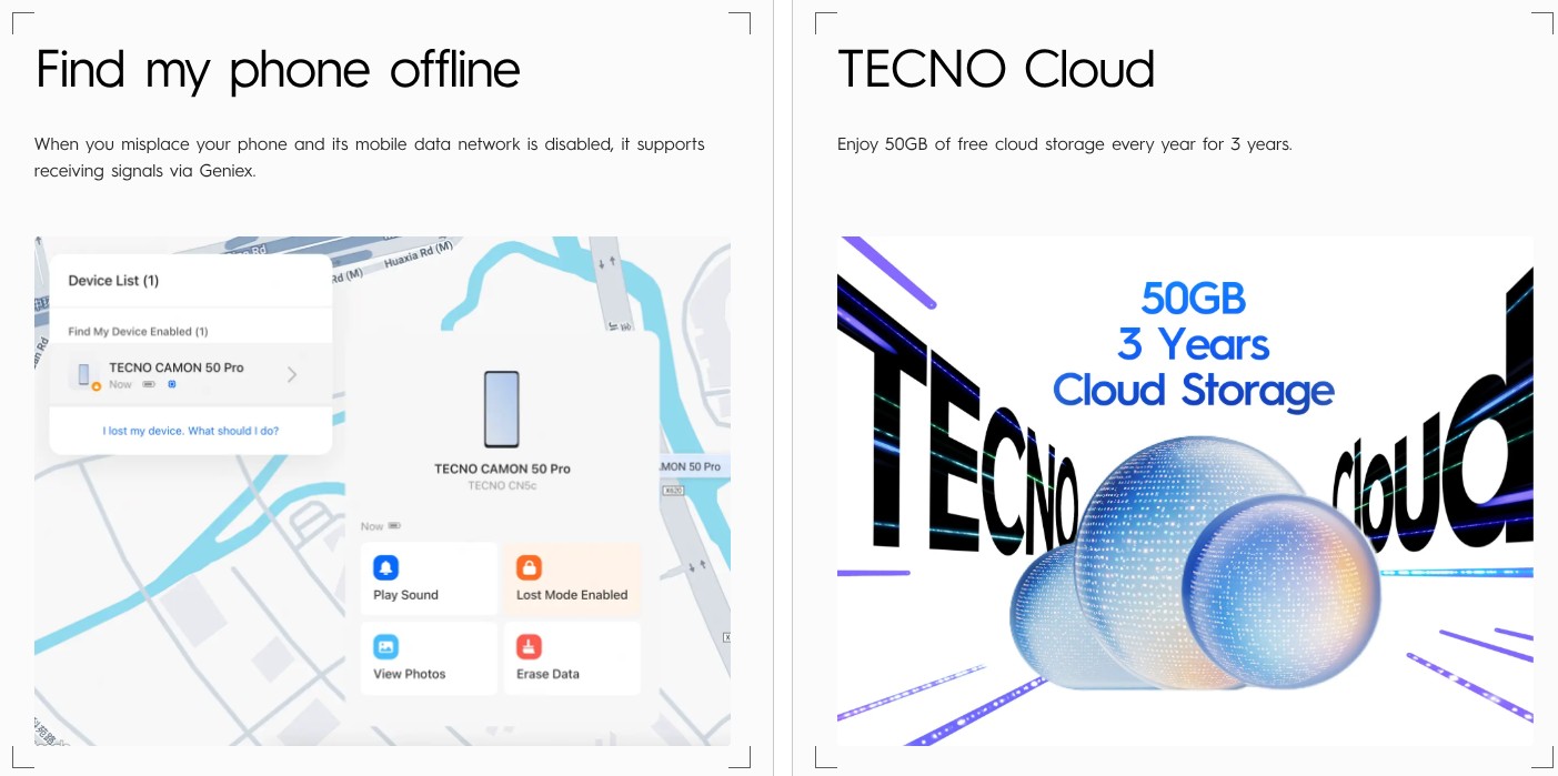 Os telefones vêm com o HiOS 16, que traz vários recursos de IA, mas também há algumas outras adições bastante úteis, como um recurso de transferência com um toque para iPhones, suporte para encontrar meu telefone off-line e 50 GB de armazenamento em nuvem gratuito por 3 anos. A Tecno diz que os dois telefones receberão três atualizações de sistema operacional e cinco anos de atualizações de segurança. Ela também garante aos usuários que os telefones permanecerão fluidos após 5 anos de uso, assim como no primeiro dia.