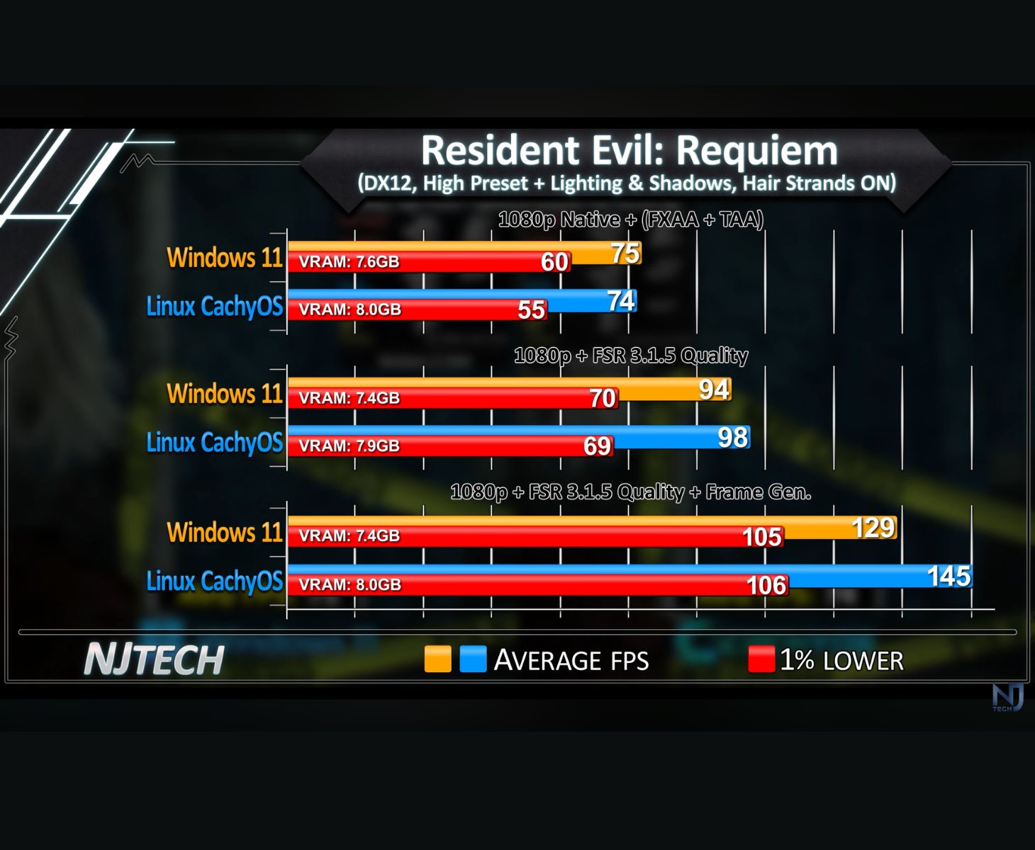 O benchmark de Resident Evil Requiem mostra que o Linux atinge 145 FPS contra 129 FPS no Windows 11 com Frame Generation