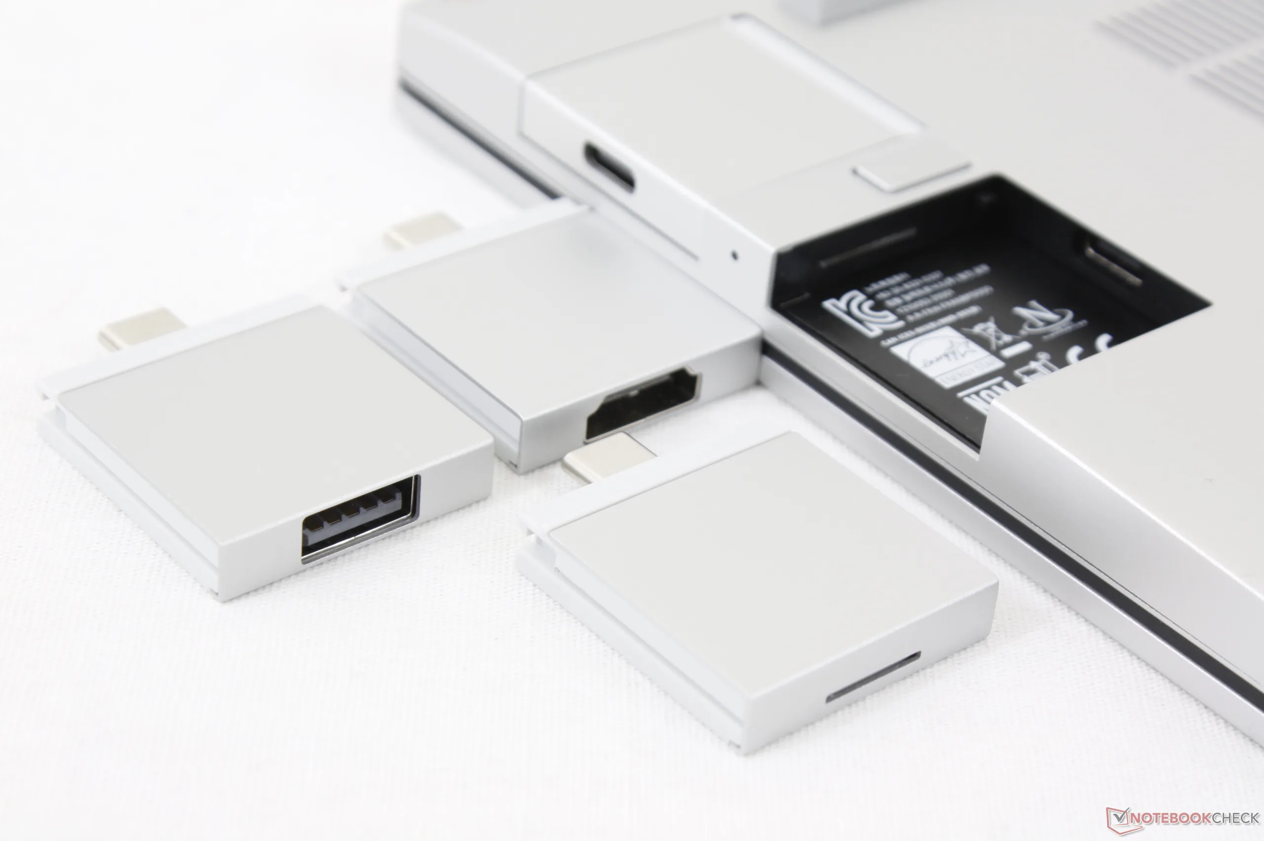 O conceito se torna ainda mais simples pelo fato de que o Framework laptop não está usando nenhuma conexão proprietária. As próprias placas de expansão são proprietárias em tamanho e design físico como mostra a figura abaixo, mas elas usam os mesmos conectores USB-C que qualquer adaptador aftermarket.