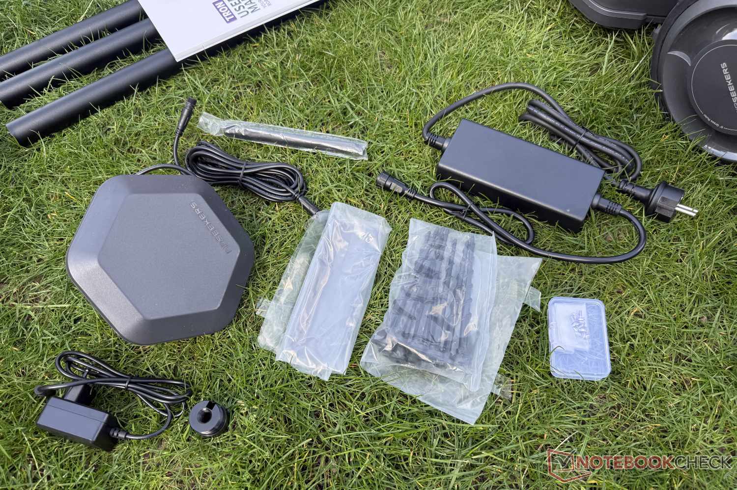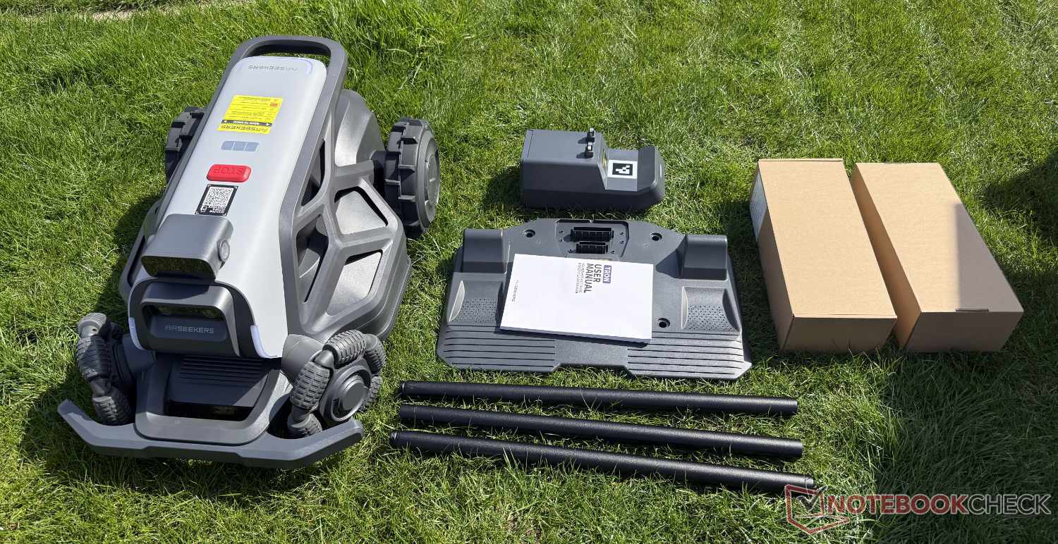 O escopo da entrega inclui muitas peças. Além do cortador de grama robótico, a estação base RTK com tubo de três partes e espigão de aterramento, a estação de carregamento (que ainda precisa ser parafusada), dois carregadores, seis lâminas sobressalentes, ferramentas e uma placa de proteção estão todos incluídos na caixa de 80 x 50 x 45 cm, que pesa 32 kg.