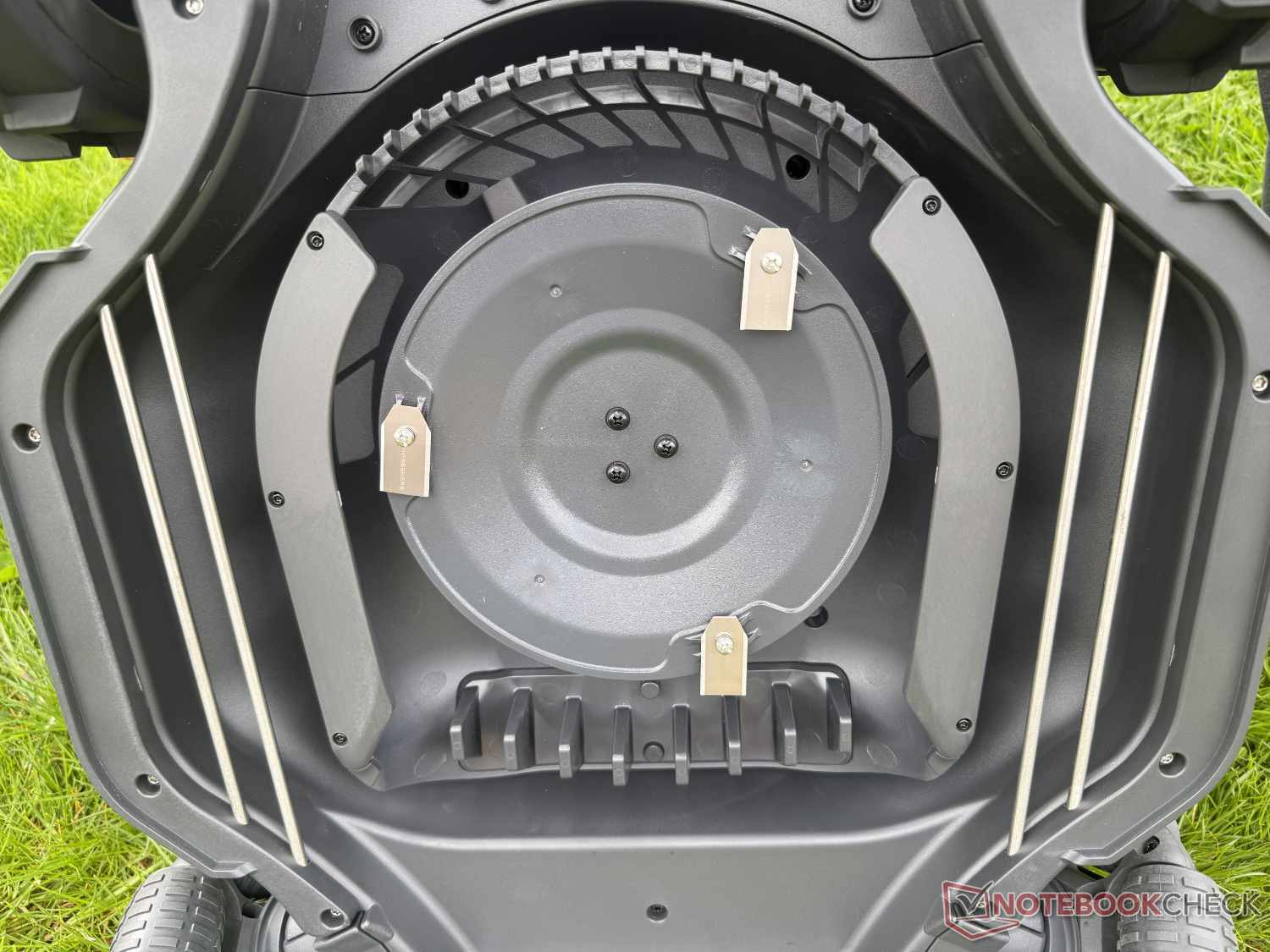 Apesar das dimensões generosas do cortador de grama robótico, ele não corta a grama com um cortador duplo, mas com um único disco de corte. Com 22 cm, é um tamanho padrão - e tem uma característica especial. Há um total de seis lâminas instaladas, duas em cima da outra com um bom centímetro de distância. Elas foram projetadas não apenas para cortar a grama na altura definida entre 30 e 90 mm (selecionável em incrementos de 10 mm), mas também para produzir um corte de grama ultrafino ao mesmo tempo. O fabricante chama isso de FlowCut mulching. Como alternativa, um disco de corte maior, de 300 mm, pode ser adaptado por US$ 50.