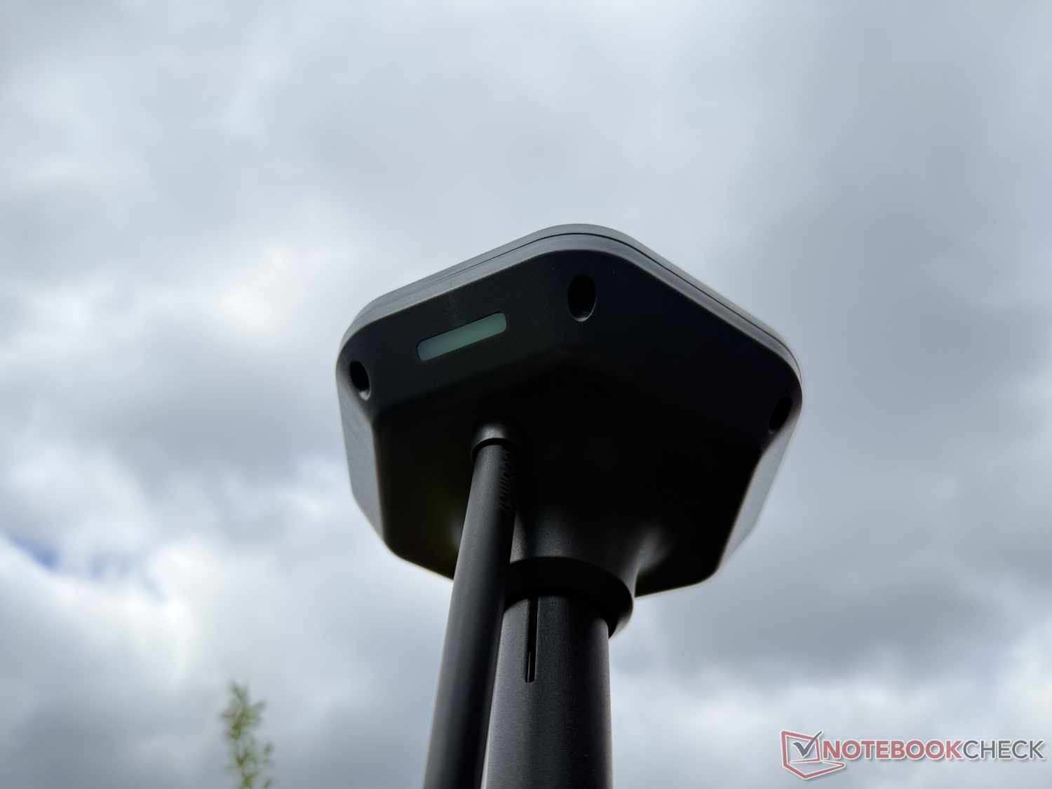 Em seguida, a estação de carregamento é fixada no chão com parafusos de aterramento e (se desejado) a antena RTK é configurada e conectada à estação de carregamento junto com o cabo de alimentação na parte traseira, atrás de uma pequena aba. Infelizmente, o cabo RTK é muito curto. Portanto, a estação deve ser posicionada perto da estação de carregamento. Como alternativa, uma unidade de fonte de alimentação adicional foi incluída em nosso dispositivo de teste, com a qual a estação também pode ser instalada longe, mas também requer sua própria tomada elétrica.