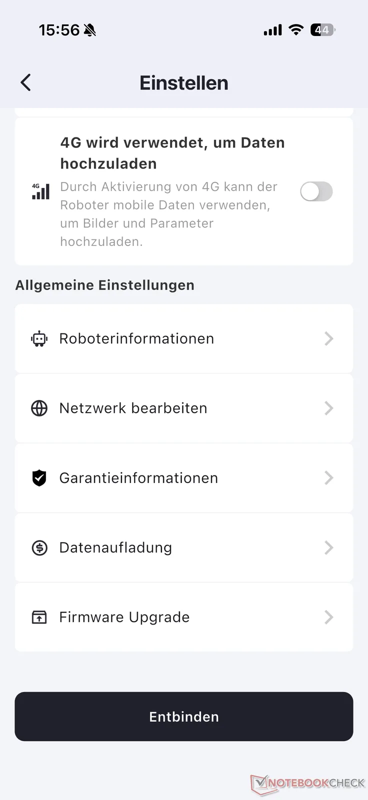 No canto superior direito, há a clássica roda dentada para abrir as configurações. Isso abre um menu que lista uma seleção rudimentar de opções relacionadas a RTK/nRTK, modo noturno, sequência de corte, ativação de 4G e carregamento de dados, bem como atualizações de firmware, além de uma visão geral da quilometragem. Não há opções para ajustar a sensibilidade da detecção de obstáculos.