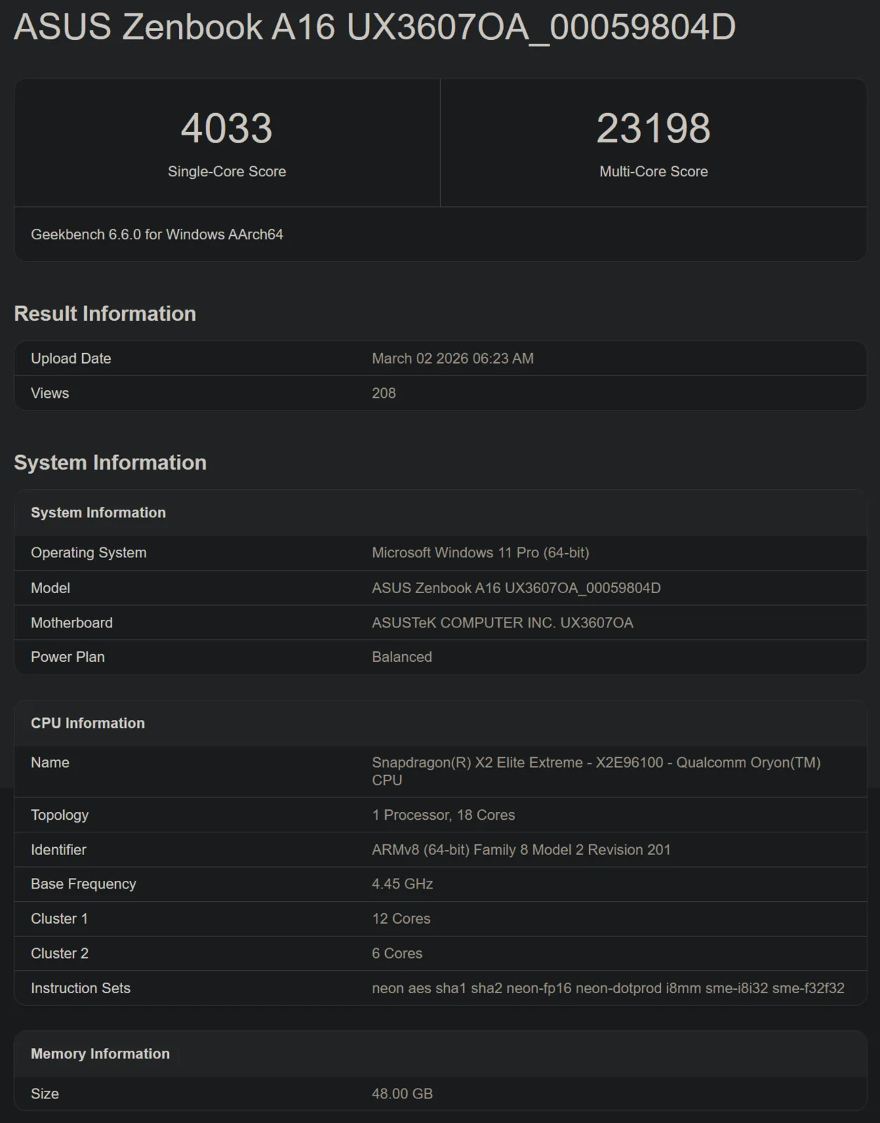 Mesmo que a Asus , HPe outros tenham exibido vários laptops com Snapdragon X2 Elite na CES 2026, eles ainda não chegaram às prateleiras, pelo menos nos mercados globais. A Qualcomm fez algumas afirmações grandiosas sobre o desempenho da CPU e da GPU do Snapdragon X2 Elite, mas a falta de dispositivos prontos para produção dificultou um pouco a verificação. Agora, podemos ver o Snapdragon X2 Elite Extreme X2E-96-100 no Geekbench.