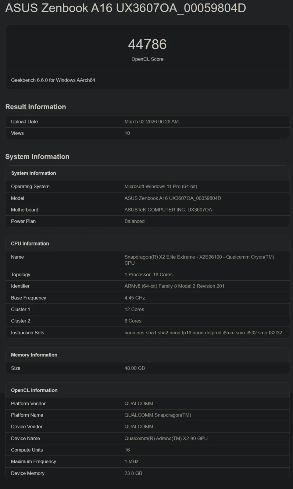 Uma segunda listagem nos dá um vislumbre do desempenho da GPU do Snapdragon X2 Elite Extreme X2E-96-100. A GPU Adreno X2-90 marca 44.786 pontos no benchmark OpenCL do Geekbench. O Geekbench diz que ela tem 16 CUs, mas a pontuação não é confiável porque a velocidade de clock informada é de apenas 1 MHz. No entanto, ele ainda consegue oferecer quase o dobro do desempenho da última geração do Adreno X1-85 De última geração, que marca apenas 23.854 pontos no mesmo benchmark.