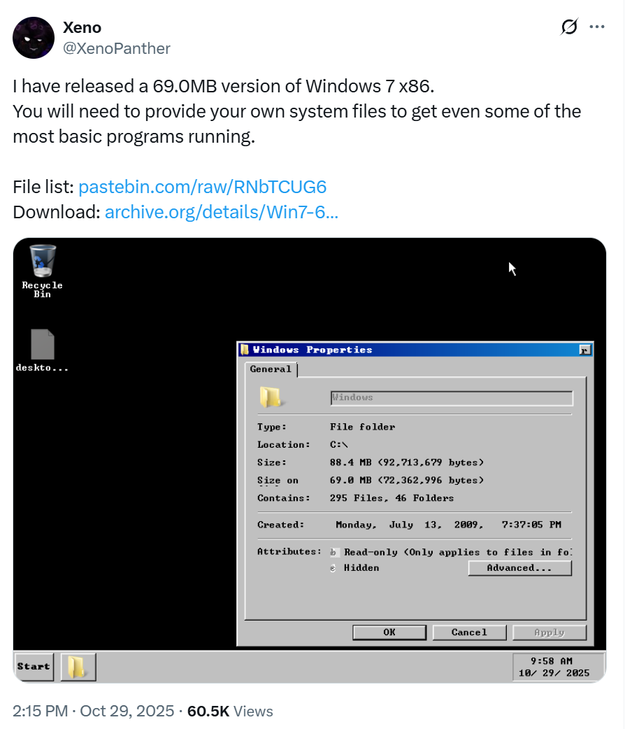 O entusiasta do Windows @XenoPanther criou e inicializou com sucesso uma versão bastante reduzida do Windows 7 que ocupa apenas 69 megabytes de espaço em disco. O projeto, , foi compartilhado on-line em 29 de outubrodemonstra até que ponto o sistema operacional pode ser reduzido em tamanho e ainda assim obter uma sequência de inicialização bem-sucedida.