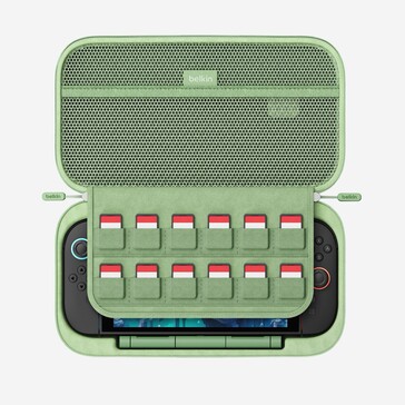 Além disso, o Belkin Charging Case Pro oferece espaço para um total de doze cartuchos de jogos e um compartimento na parte interna da tampa, que pode ser usado para cabos ou um pano de limpeza de microfibra, entre outras coisas. Um revestimento rígido oferece proteção ideal para o Nintendo Switch 2, enquanto uma alça de transporte facilita o transporte. O Belkin Charging Case Pro é carregado por meio de uma porta USB-C na parte frontal.