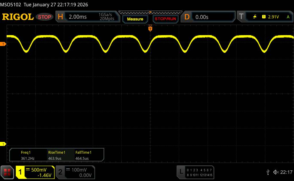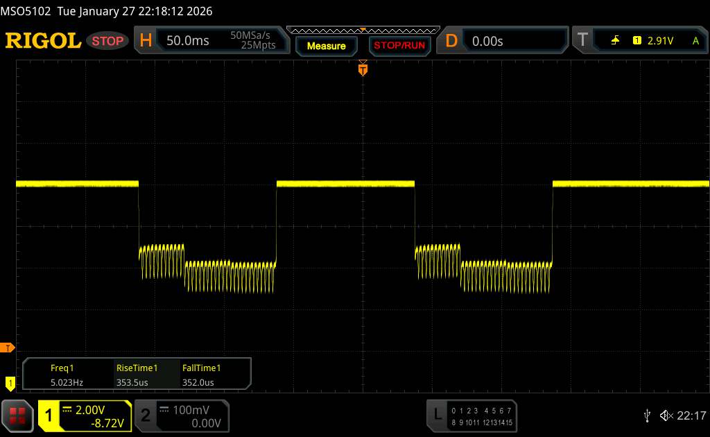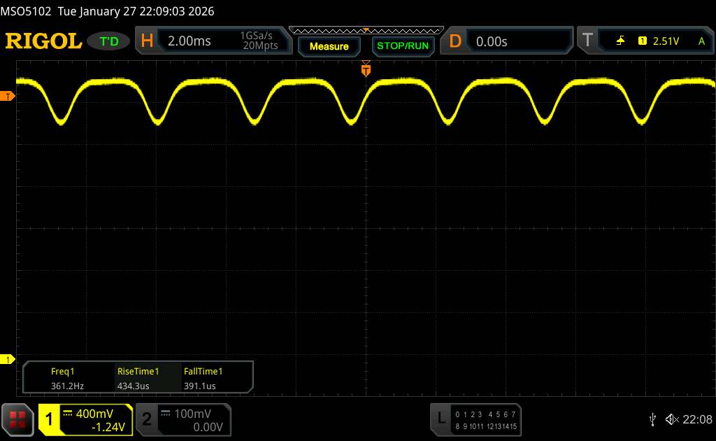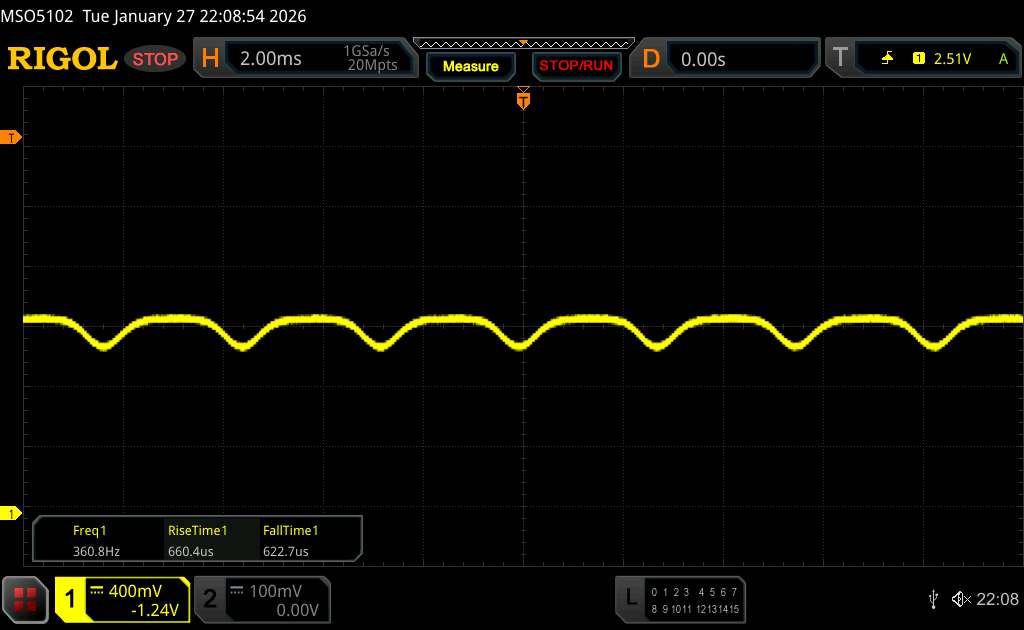 Usando o osciloscópio, medimos uma frequência básica de 360 Hz. No entanto, o escurecimento PWM de alta frequência de mais de 1.500 Hz também é usado, portanto, quaisquer efeitos sobre a saúde de usuários sensíveis devem permanecer limitados.