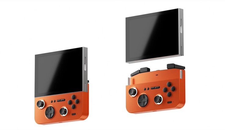 À primeira vista, o GameMT E5 ModX parece um dispositivo portátil padrão para jogos no formato de um Nintendo Game Boy bem largo. A característica especial é que o dispositivo portátil tem um design modular, de modo que a tela pode ser separada do módulo do controlador.
