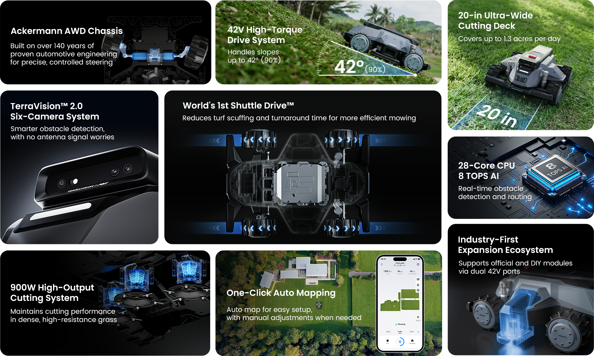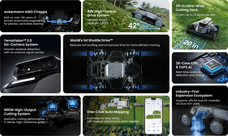 O mapeamento deve funcionar automaticamente por meio de IA, utilizando o sistema TerraVision 2.0 com seis câmeras e uma CPU de 28 núcleos que fornece 8 TOPS de desempenho de IA. O ecossistema expansível também parece promissor.