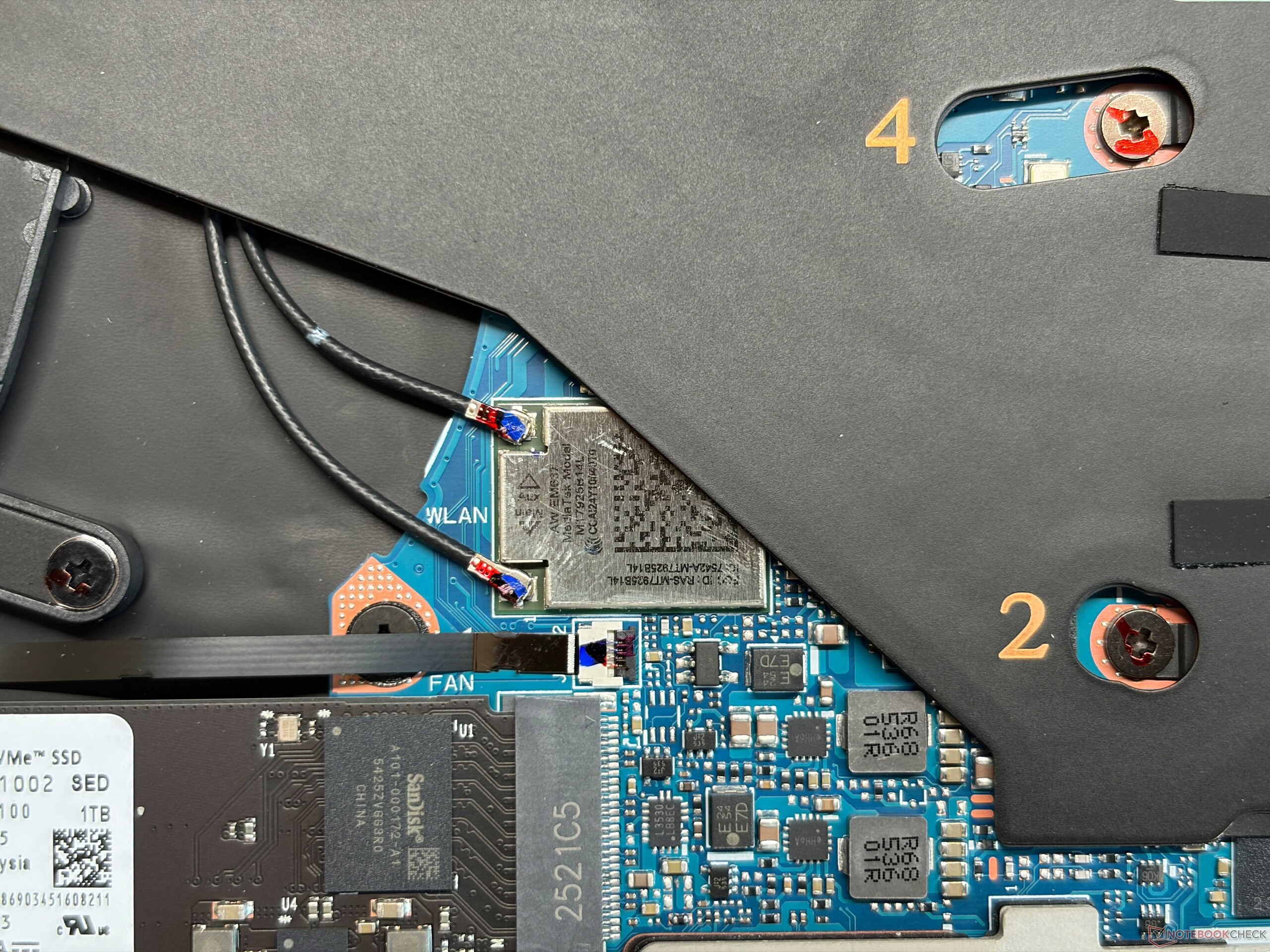 A Asus aumentou a capacidade da bateria de 78 para 83 Wh, e a duração da bateria no teste WLAN a 150 cd/m² aumentou de 12 para pouco mais de 13 horas. No entanto, a vantagem é igualada com o brilho máximo devido à tela mais brilhante.