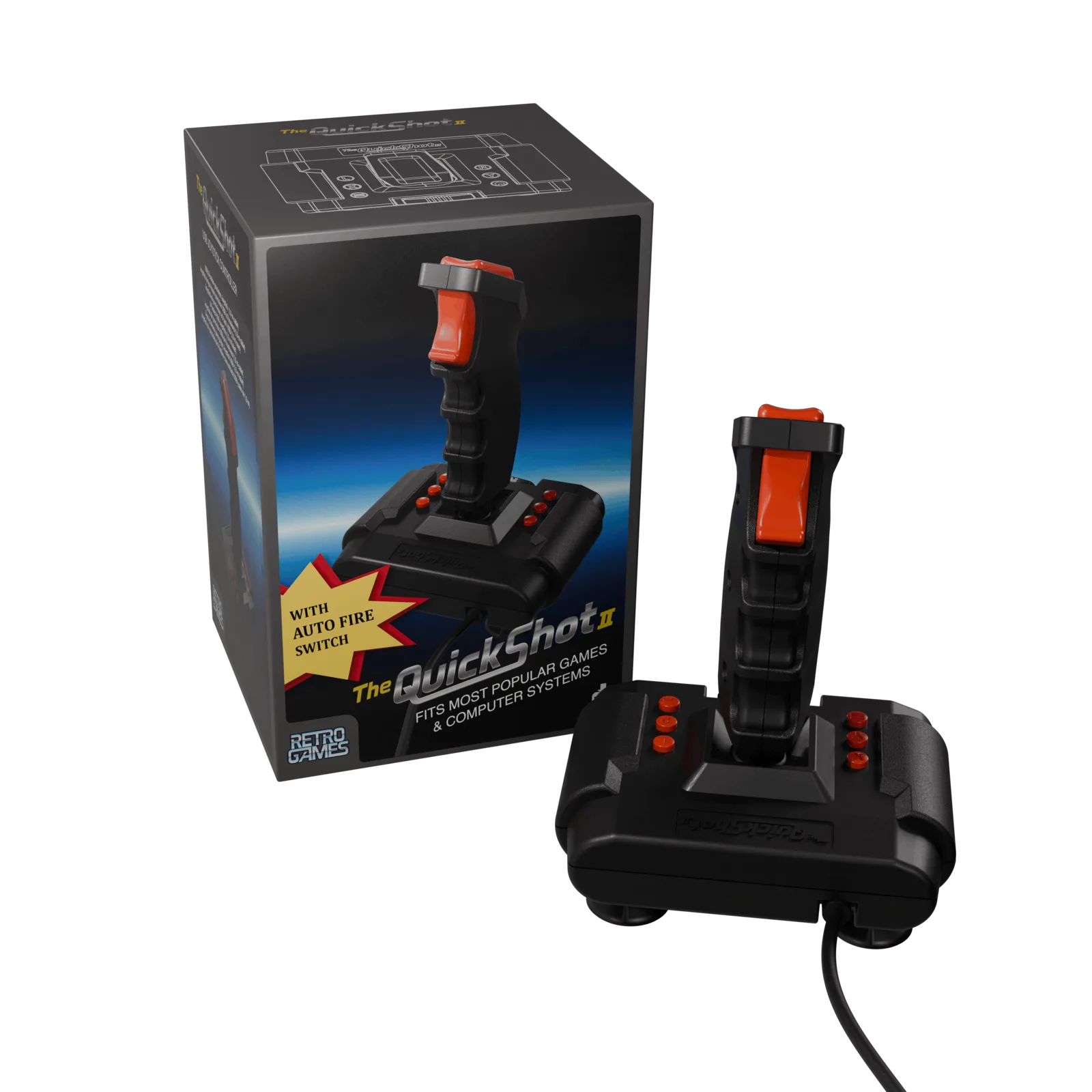 Para acompanhar os controles modernos, o Quickshot II foi atualizado com suporte a USB para maior comodidade e inclui um cabo USB de 180 cm. Além de PCs e vários dispositivos retrô, o controle também funciona com as seguintes réplicas de computadores domésticos fabricadas pela Retro Games: TheC64, The Spectrum, TheA500 e o futuro TheA1200. Dito isso, ele não pode se conectar ao C64 original e ao Commodore Amiga por meio da interface de 9 pinos, nem oferece conectividade sem fio. Outros recursos notáveis incluem microinterruptores precisos, uma articulação esférica, dois botões de ação, seis botões de disparo programáveis, um botão de disparo automático e ventosas.
