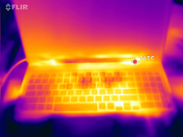 (+) A temperatura máxima no lado superior é 36 °C / 97 F, em comparação com a média de 40.5 °C / 105 F , variando de 21.2 a 68.8 °C para a classe Gaming.