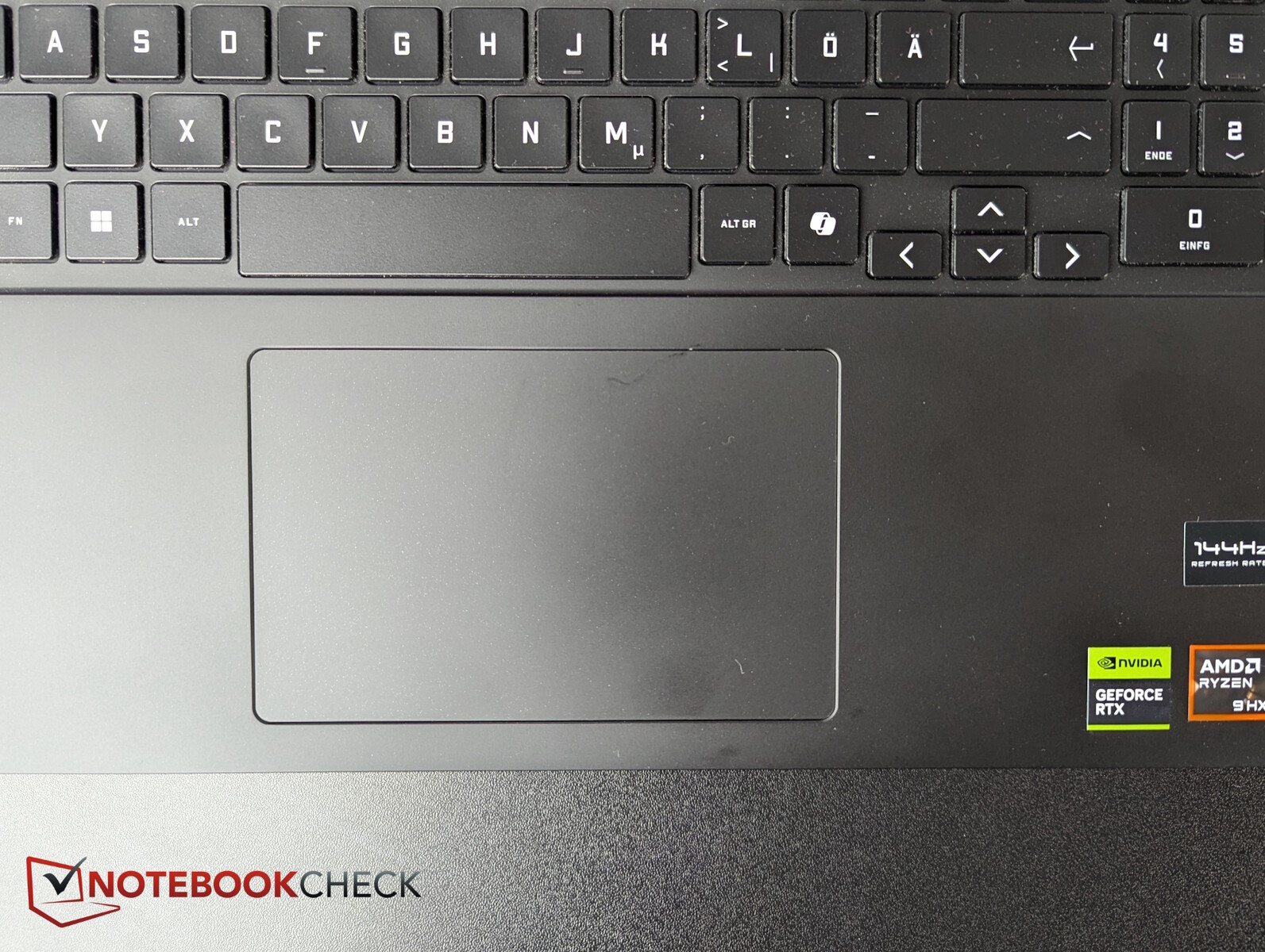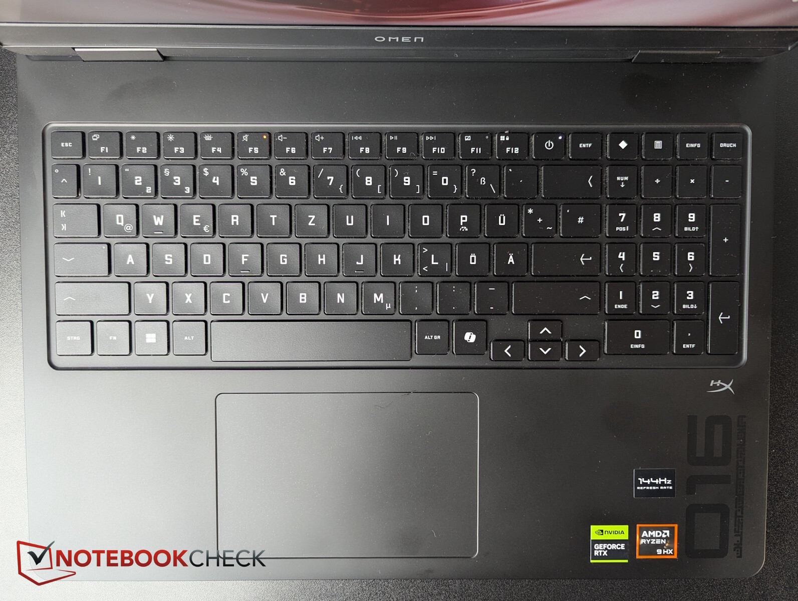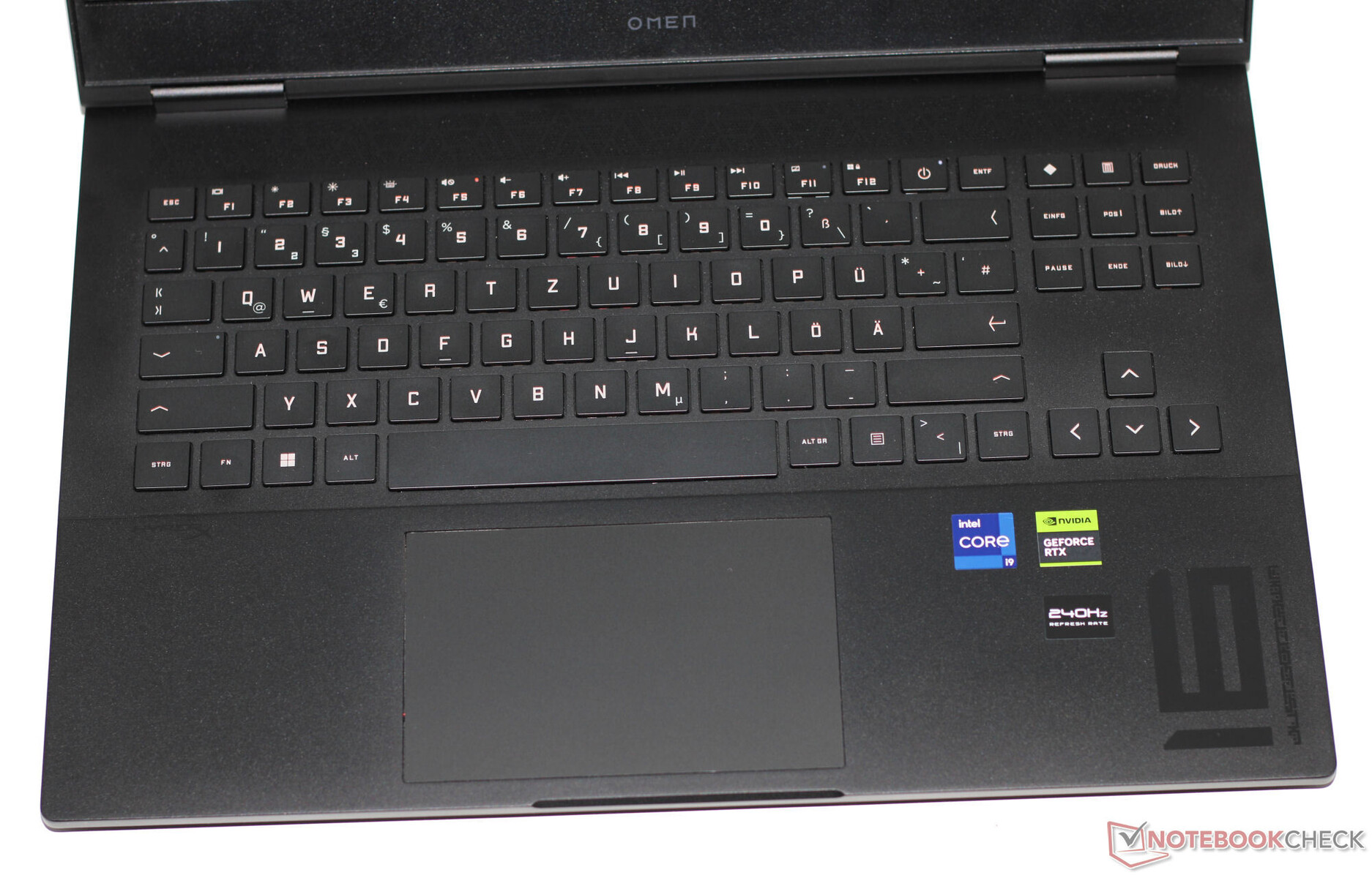 A luz de fundo RGB de 4 zonas oferece dois níveis de brilho. A HP apresenta um rollover de 26 teclas com anti-ghosting. O deslocamento das teclas é curto, mas parece mais profundo do que é, graças ao feedback bem amortecido. A digitação é rápida, confortável e silenciosa.
