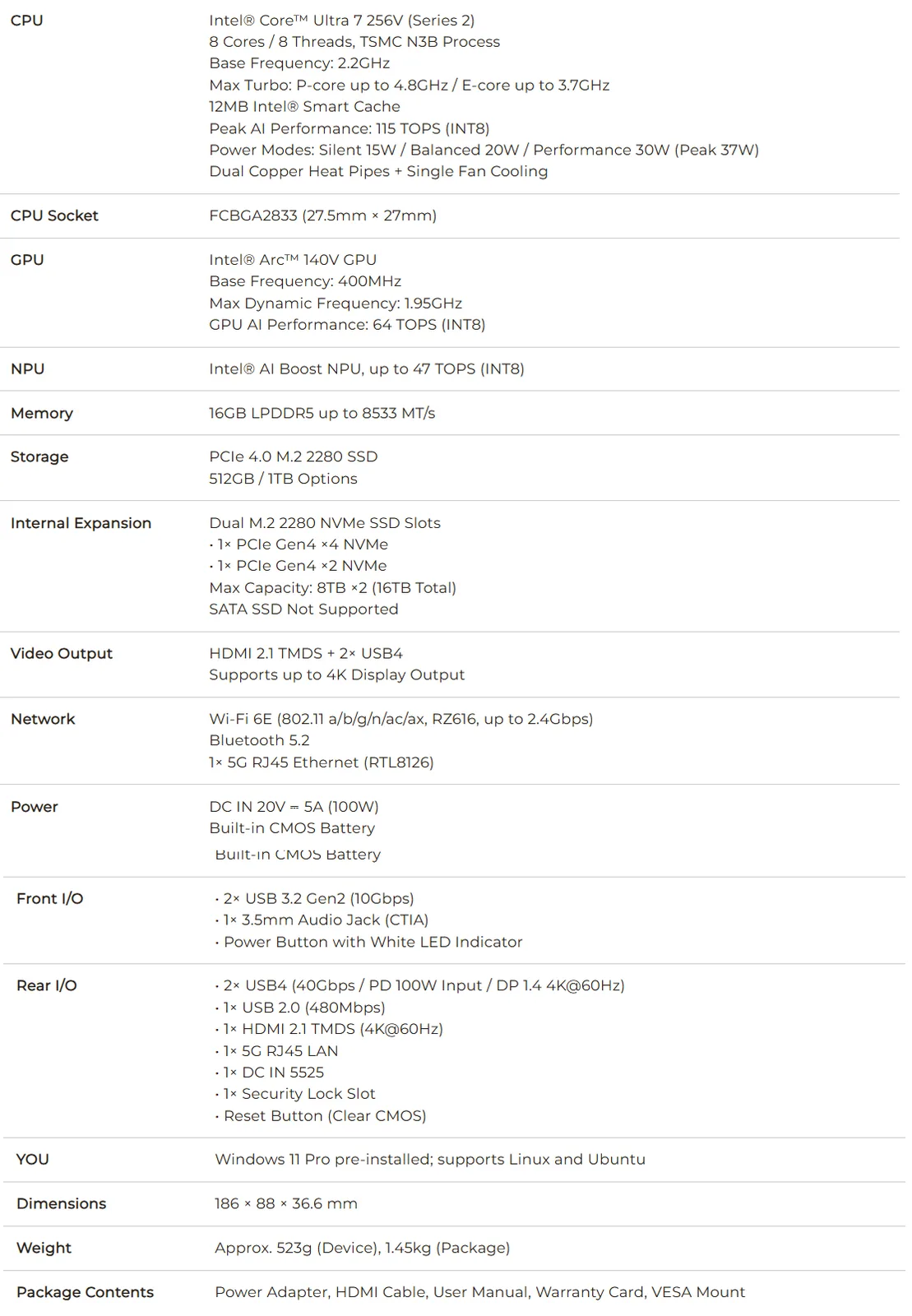Sob o capô, esse pequeno mini PC inclui o Intel Core Ultra 7 256V, um processador de médio porte da linha Lunar Lake. Ele possui o Arc 140V que pode lidar sem problemas com um bom número de jogos modernos na resolução de 1080p com ajustes nas configurações visuais.