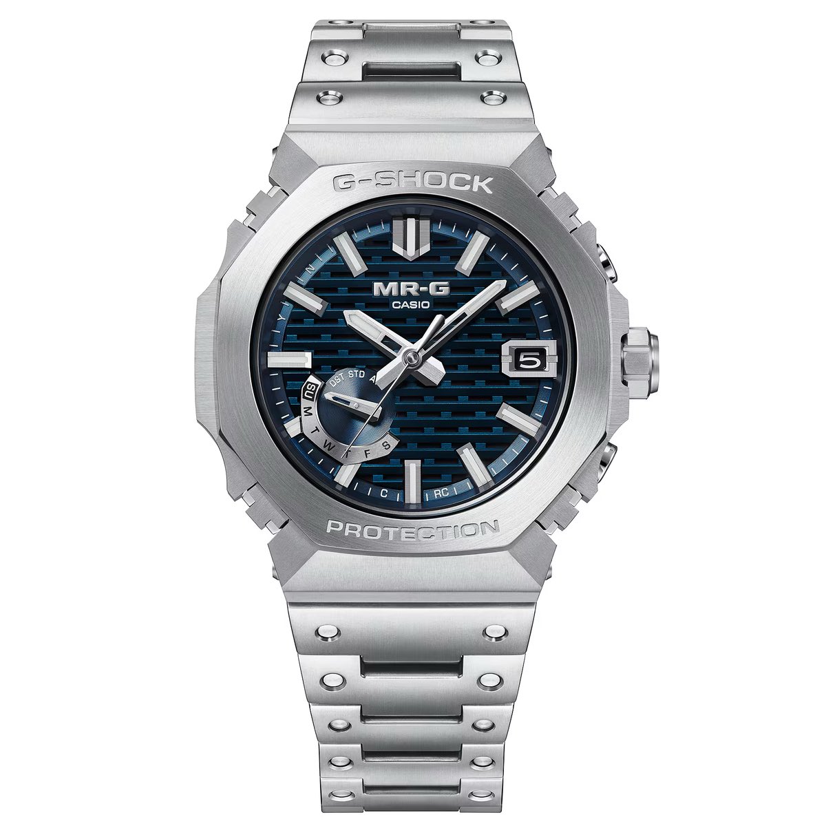 O trabalho artesanal e a construção meticulosos mostram por que o MR-G está no topo da linha G-Shock. A luneta, que normalmente é moldada como uma peça única, é dividida em 27 componentes separados, e as covinhas na pulseira também são feitas de peças separadas, com cada componente polido à mão por artesãos habilidosos para um acabamento espelhado sem distorção.