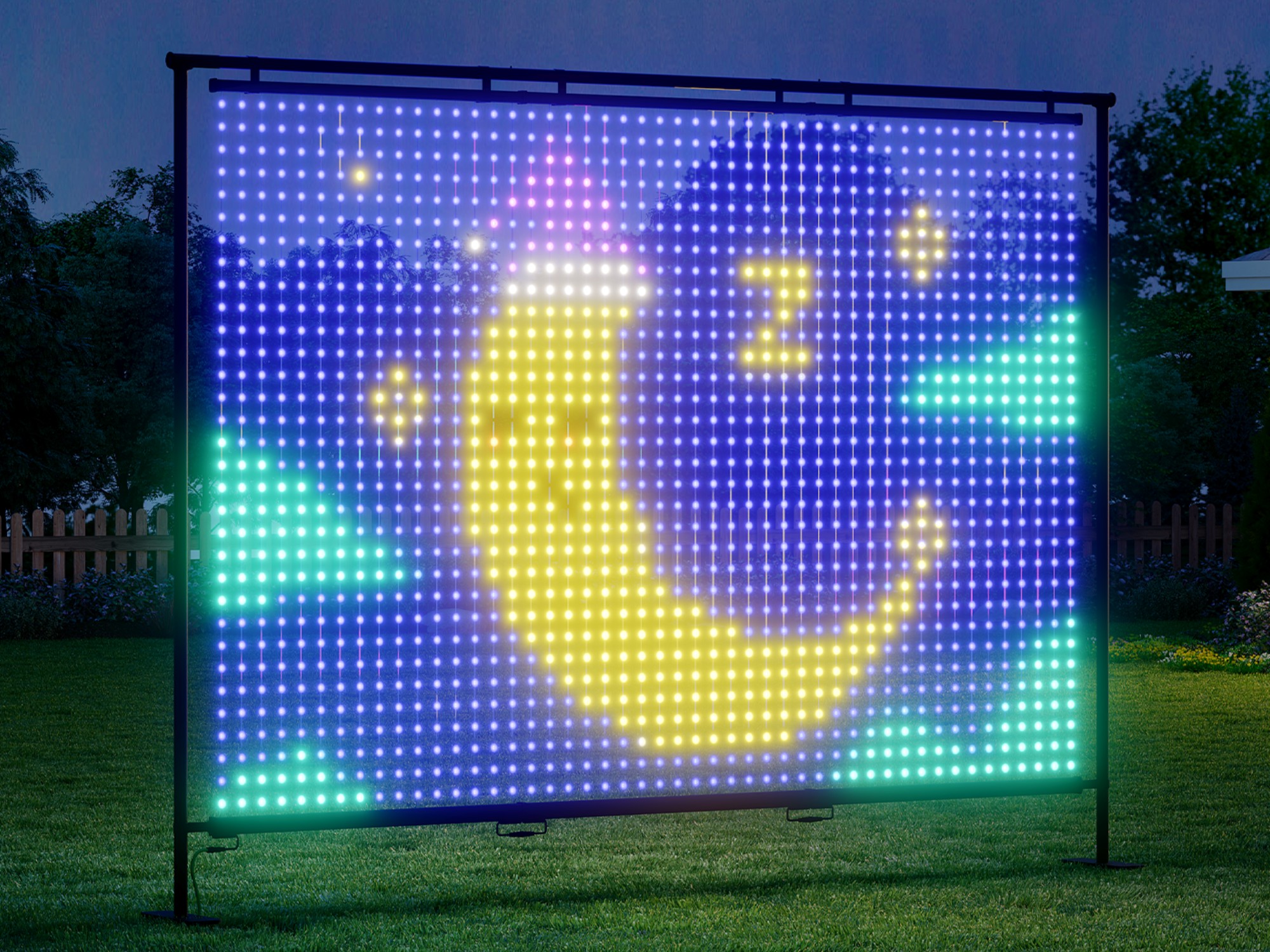 O Govee Lightwall reúne 1.536 LEDs RGBIC em uma grade precisa de 32×48 pixels, alcançando um pixel pitch de apenas 1,96 polegadas - a maior densidade de sua categoria. O resultado são imagens excepcionalmente nítidas com gradientes de cores perfeitos, seja exibindo uma cena completa do outro lado do pátio ou revelando detalhes intrincados de perto. Alimentados por uma taxa de quadros de 35 FPS de nível cinematográfico, os efeitos dinâmicos permanecem fluidos e sem atrasos, dando vida a animações complexas com movimentos suaves e naturais.