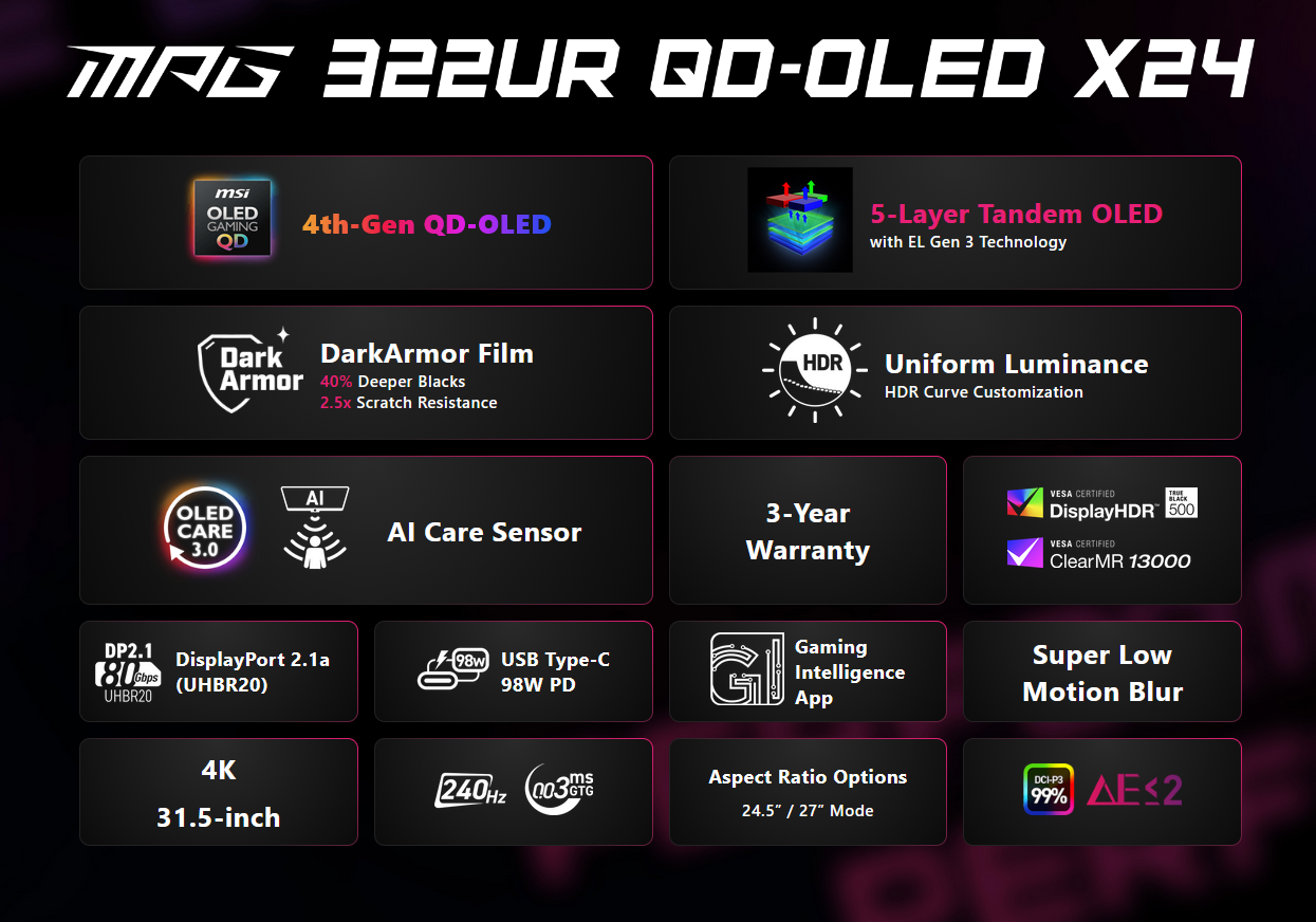 O novo monitor para jogos da MSI MPG 322UR QD-OLED X24 da MSI acaba de ser anunciado, e sua página de produto está oficialmente disponível. Essa tela de 31,5 polegadas usa uma estrutura especializada de painel em tandem e vem com recursos de alta largura de banda, graças ao DisplayPort 2.1.