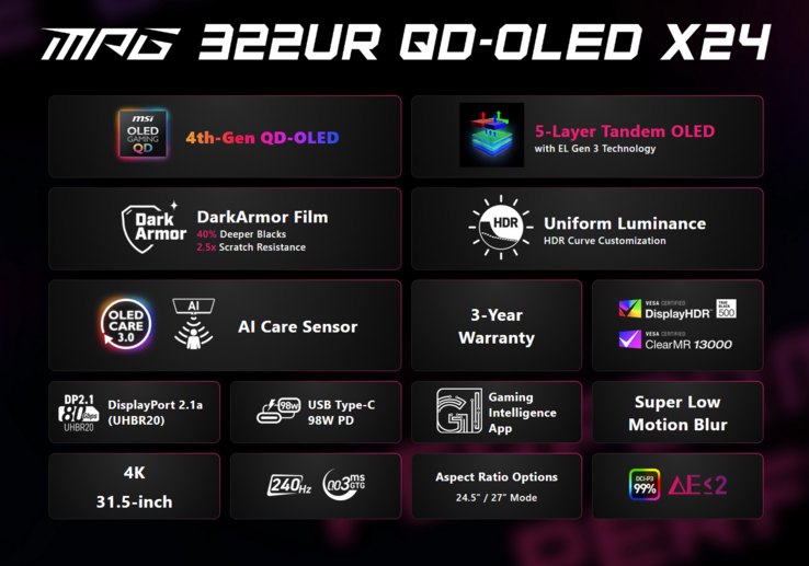 Em termos de painel, o modelo "X24" é equipado com um painel QD-OLED em tandem de quarta geração (provavelmente da LG) baseado na tecnologia EL Gen 3. Essa configuração de 5 camadas afirma aumentar a eficiência da luz em 30% e, ao mesmo tempo, reduzir o consumo de energia. A proteção é feita pela película "DarkArmor" - a MSI afirma que ela aumenta a resistência a arranhões em 2,5 vezes e aprofunda os pretos em 40% - e por um sensor AI Care alimentado por NPU que escurece a tela quando nenhuma presença humana é detectada para evitar queimaduras. Ele automatiza a proteção dos pixels com base na "consciência ambiental em tempo real".