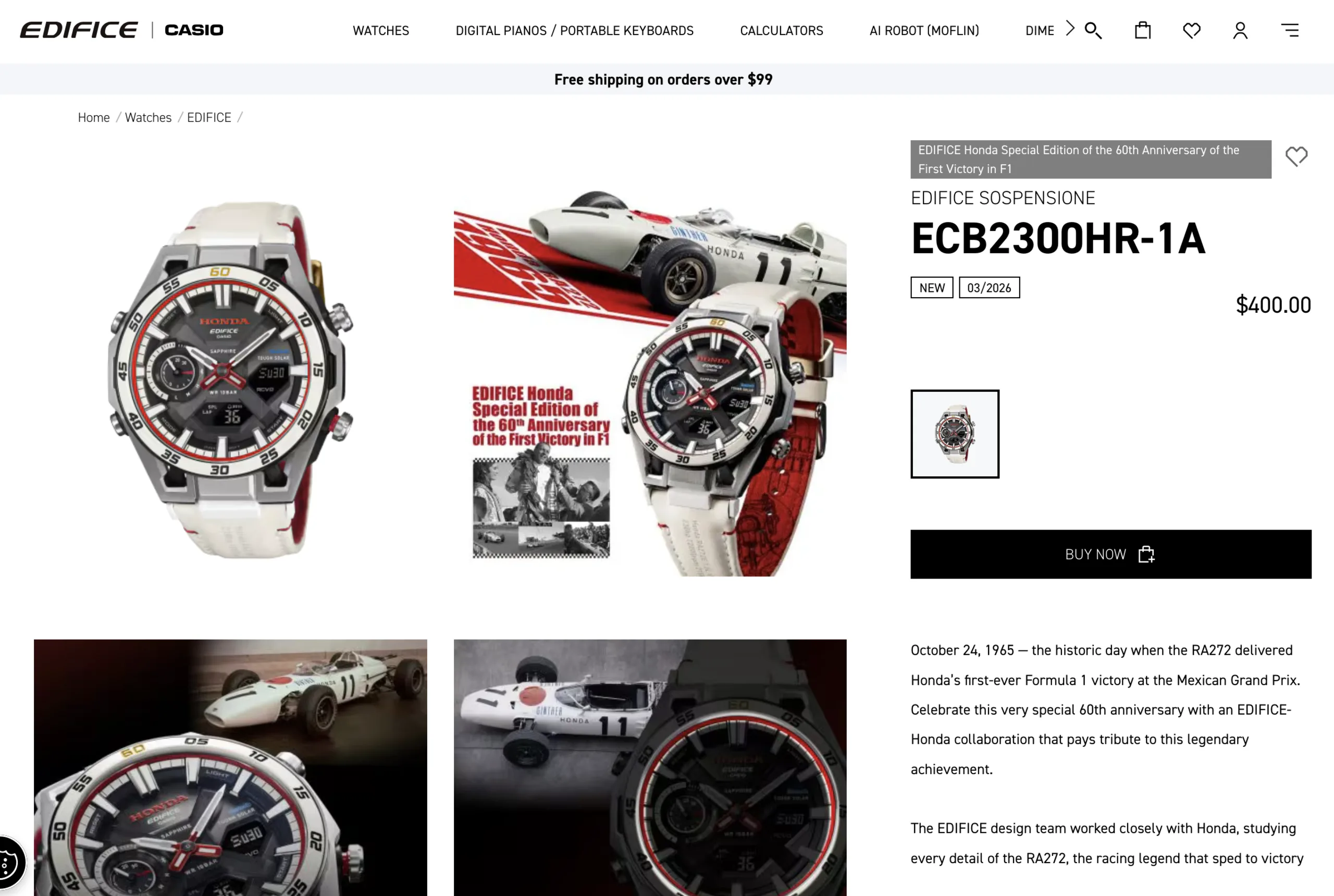 O modelo é baseado na plataforma Edifice Sospensione e traz várias sugestões de design inspiradas no carro de corrida Honda RA272. A pulseira de couro branco com forro vermelho lembra a pintura de corrida da Honda, enquanto o mostrador apresenta detalhes em vermelho e a marca Honda. A caixa mede 50,2 × 45,8 × 11,8 mm e pesa 67 g.