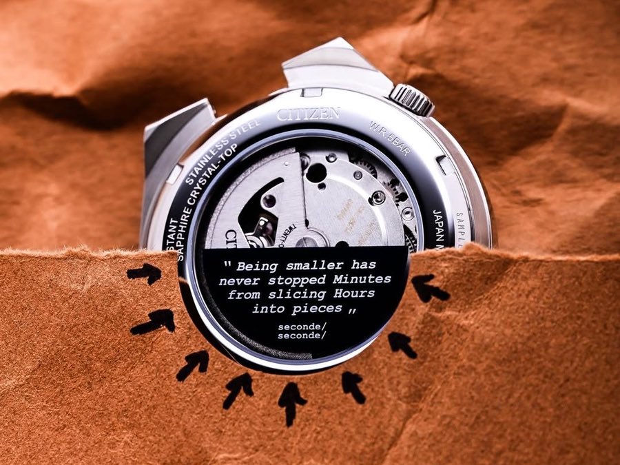 O tema lúdico também se estende ao fecho da pulseira, que traz marcas de "corte" gravadas, e ao fundo da caixa de exposição, que apresenta uma mensagem da seconde/seconde/: "Ser menor nunca impediu que a Minutes cortasse a Hours em pedaços", explicando a narrativa do design.