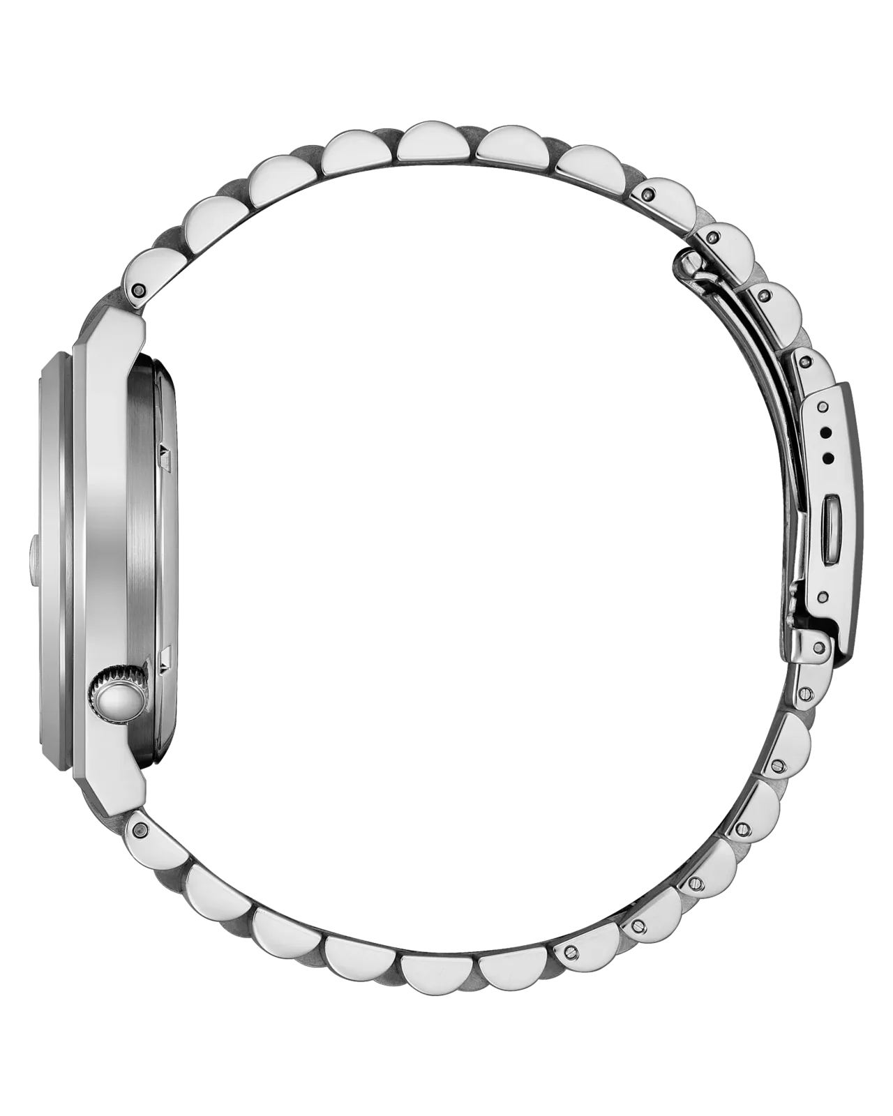 O relógio mantém as proporções acessíveis do Tsuyosa, alojado em uma caixa de 40 mm em aço inoxidável prateado com uma pulseira integrada de três elos. Ele pesa 136 gramas e se ajusta a pulsos que variam de 145 a 208 mm, graças a um fecho dobrável com botão de pressão. Um cristal de safira protege o mostrador, enquanto uma janela de data ampliada às 3 horas e ponteiros e marcadores luminosos preservam a usabilidade diária. A resistência à água é classificada em 50 metros, o que o torna adequado para uso diário, mas não para uso aquático sério.