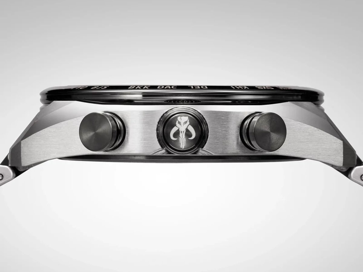 O design geral parece relativamente contido. O mostrador preto texturizado apresenta três submostradores e índices aplicados em prata, com a maioria das referências Mandalorianas escondidas nos detalhes. Há um emblema de um mitosauro gravado na coroa, enquanto o fundo da caixa é gravado com o texto "The Mandalorian" ao lado de seu icônico capacete.