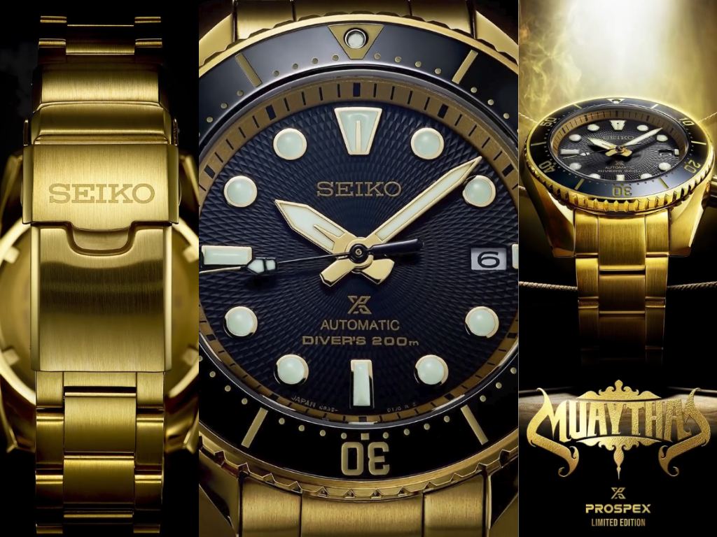 Seiko Tailândia revelou completamente a edição limitada do Prospex Muay Thai que havia revelado anteriormentee o relógio final é um ousado mergulhador todo em ouro, com mostrador preto texturizado e pulseira dourada combinando.
