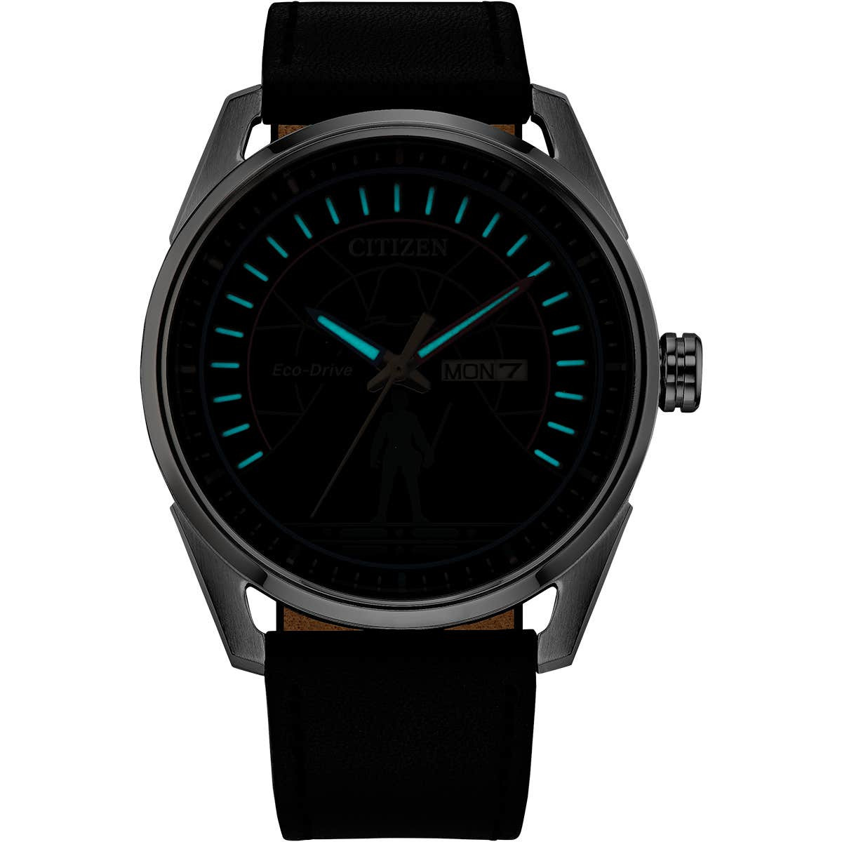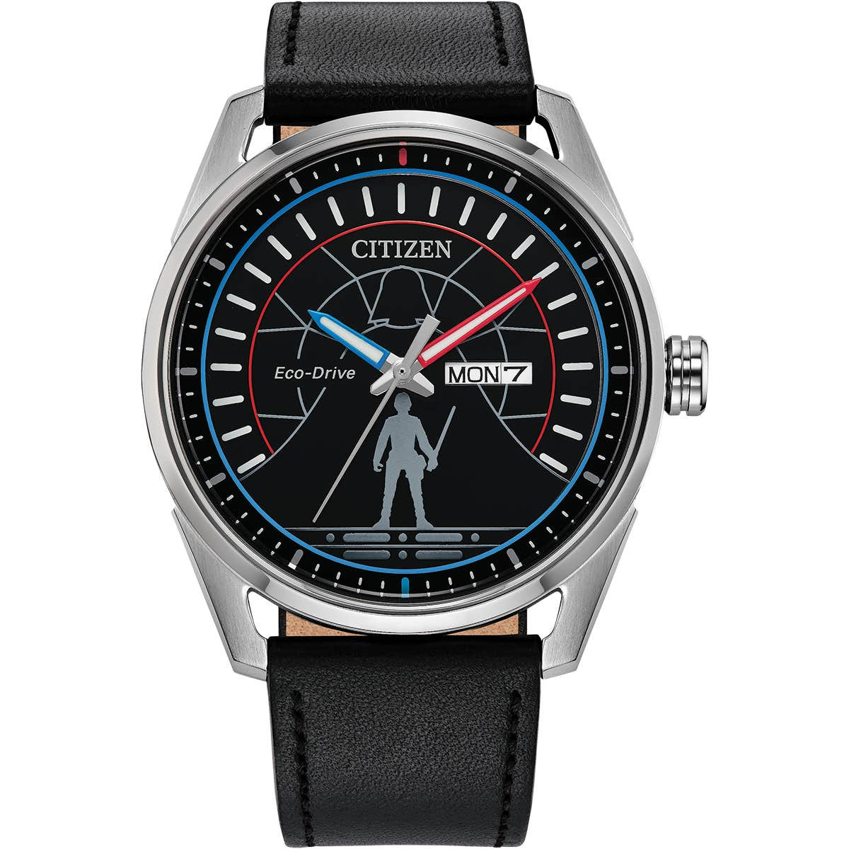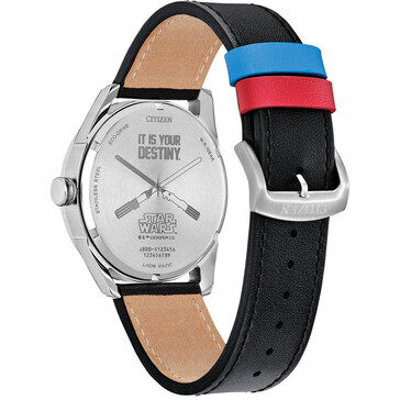 O mostrador exibe um gráfico do icônico duelo entre Luke Skywalker e Darth Vader em Cloud City, do filme O Império Contra-Ataca. Uma silhueta de Skywalker é visível na posição das seis horas, enquanto o capacete de Vader está presente na parte superior do mostrador. O relógio usa ponteiros vermelhos e azuis para representar seus sabres de luz, que são complementados por presilhas combinando com a pulseira de couro preto.