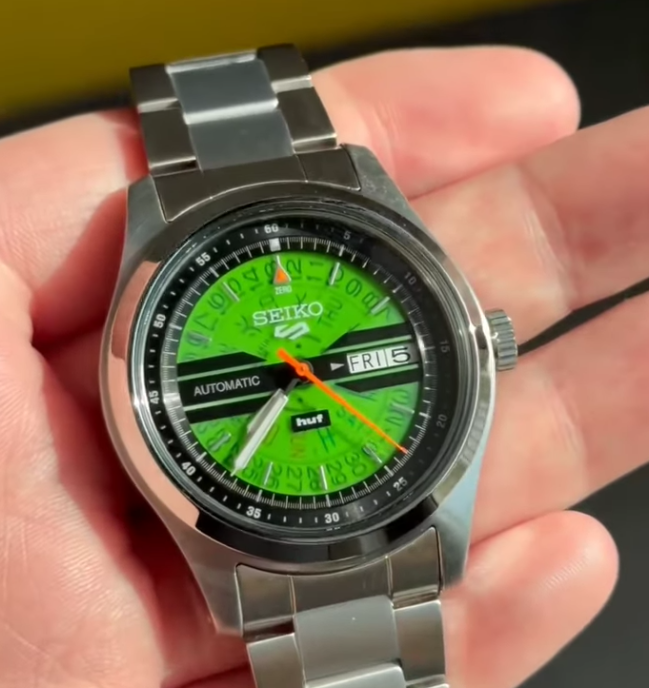 As imagens práticas recém-vistas, graças ao site @SeikoLeaks no YouTubenos dão uma visão prática de como o mostrador de acetato "HUF Green" interage com a luz. Como esperado, há um alto grau de transparência que expõe as rodas mecânicas de dia e data sob a superfície. A execução do mostrador, inspirada no "Time Sonar" dos anos 70, cria um efeito tridimensional em camadas que normalmente não é visto na linha Seiko 5 de nível básico. Embora as imagens promocionais muitas vezes higienizem essas texturas, as fotos físicas revelam um caráter industrial único, com a barra horizontal preta "Automatic" e o logotipo "huf" às 6 horas parecendo flutuar acima do disco verde.