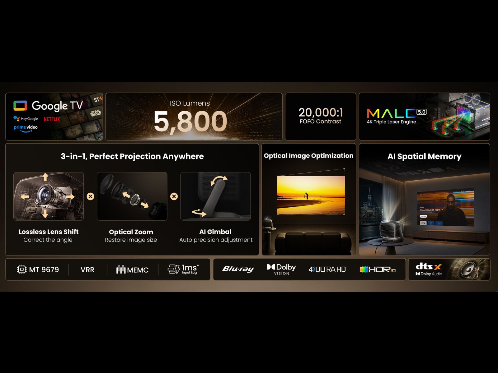 Os recursos inteligentes adicionais incluem ajuste automático da tela, foco automático, prevenção de obstáculos, adaptação da cor da parede e mecanismos de proteção para os olhos, todos manipulados por meio de ajustes de IA em tempo real. O projetor é executado em um sistema baseado no Google e inclui 4 GB de RAM com 64 GB de armazenamento interno.