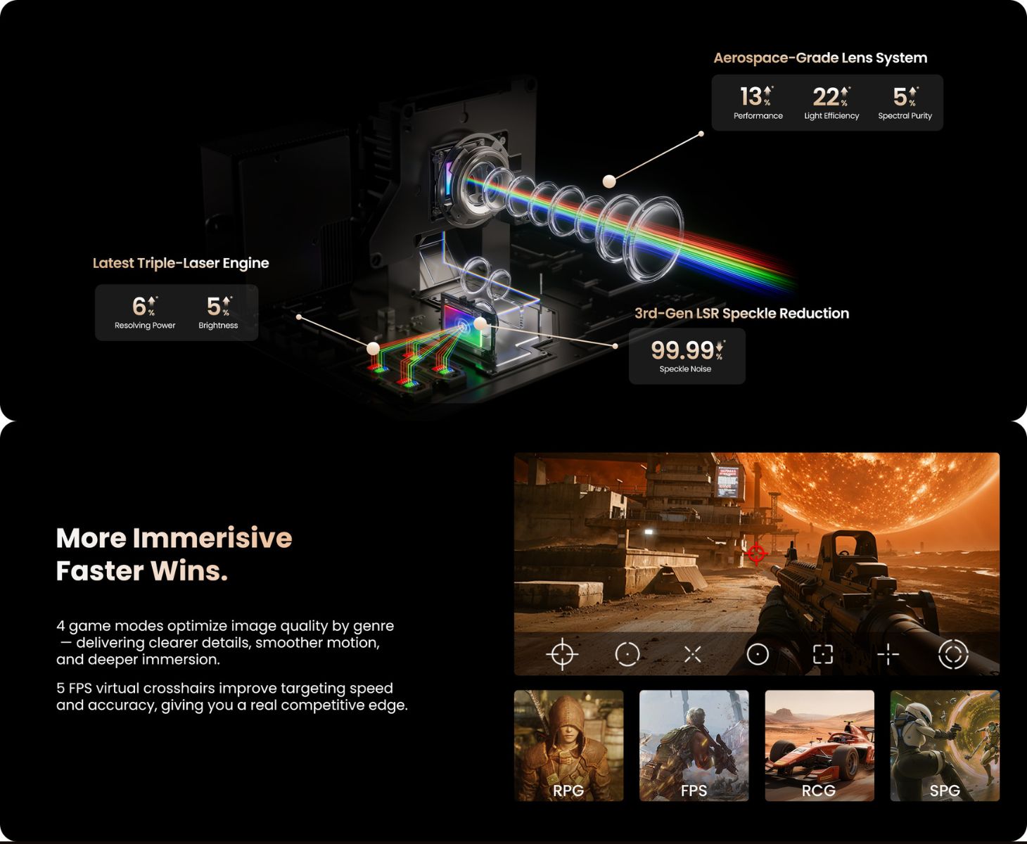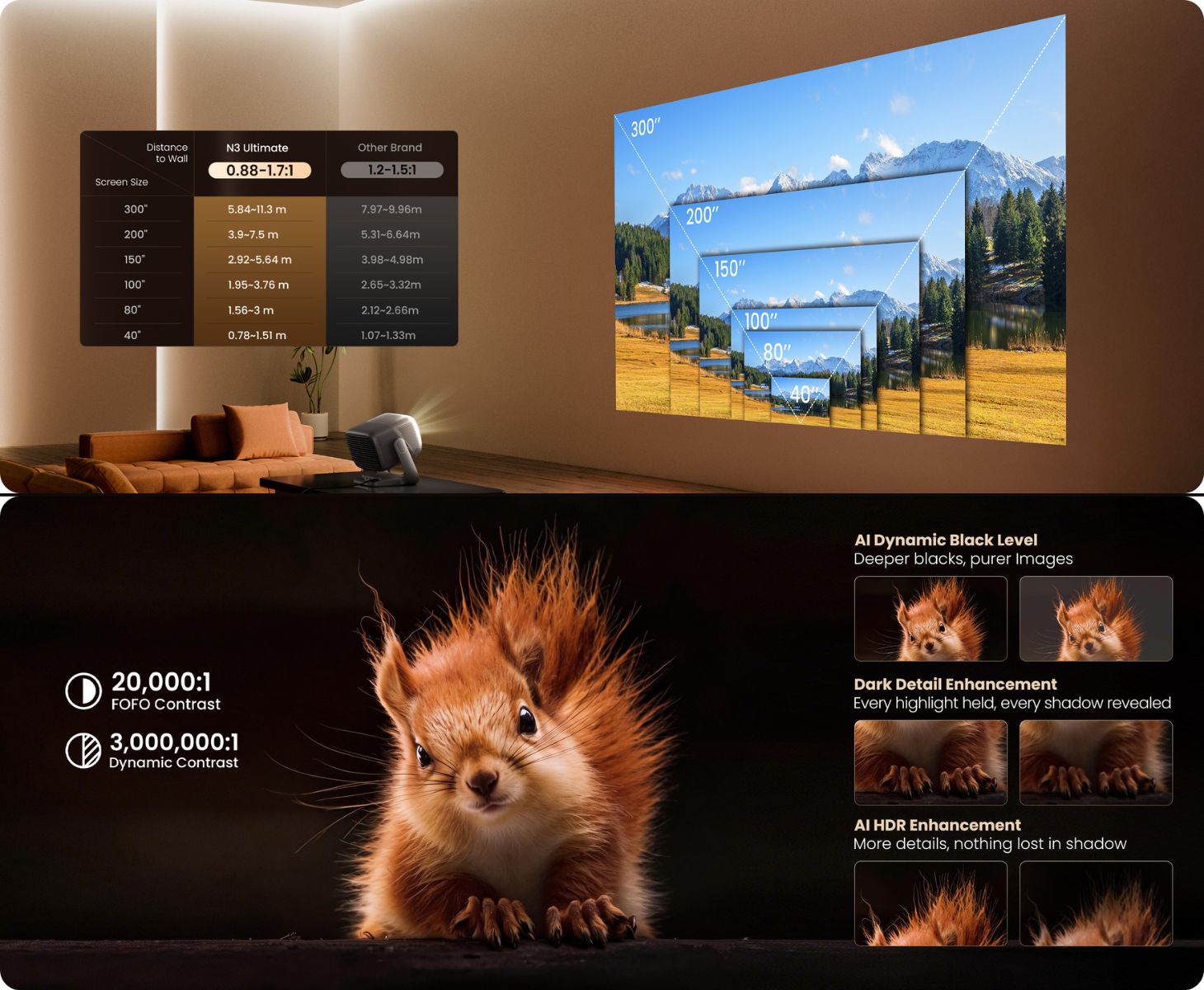 Em termos de qualidade de imagem, o N3 Ultimate usa uma fonte de luz tri-laser e oferece resolução 4K com uma gama de cores BT.2020 de 110% e Delta E de cerca de 0,7. O projetor também é classificado para uma taxa de contraste de 20.000:1 e suporta Dolby Vision e HDR10, além de Dolby Audio e DTS-X para saída de som.