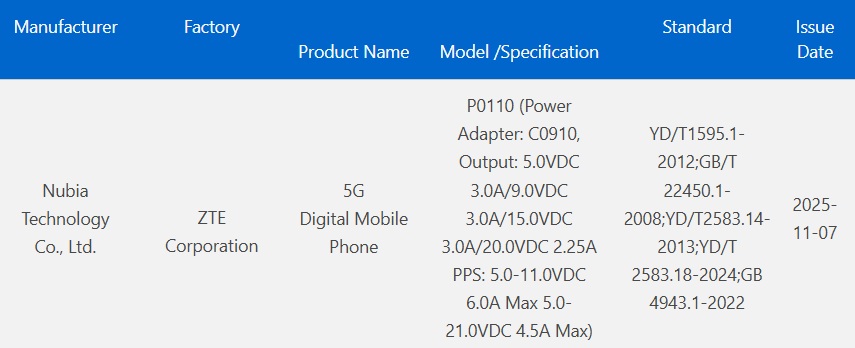 A certificação 3C do smartphone, emitida recentemente, revela que o Nubia P0110 pode vir com um carregador de 94,5, o que significa que ele também é um dos principais concorrentes no departamento de carregamento.