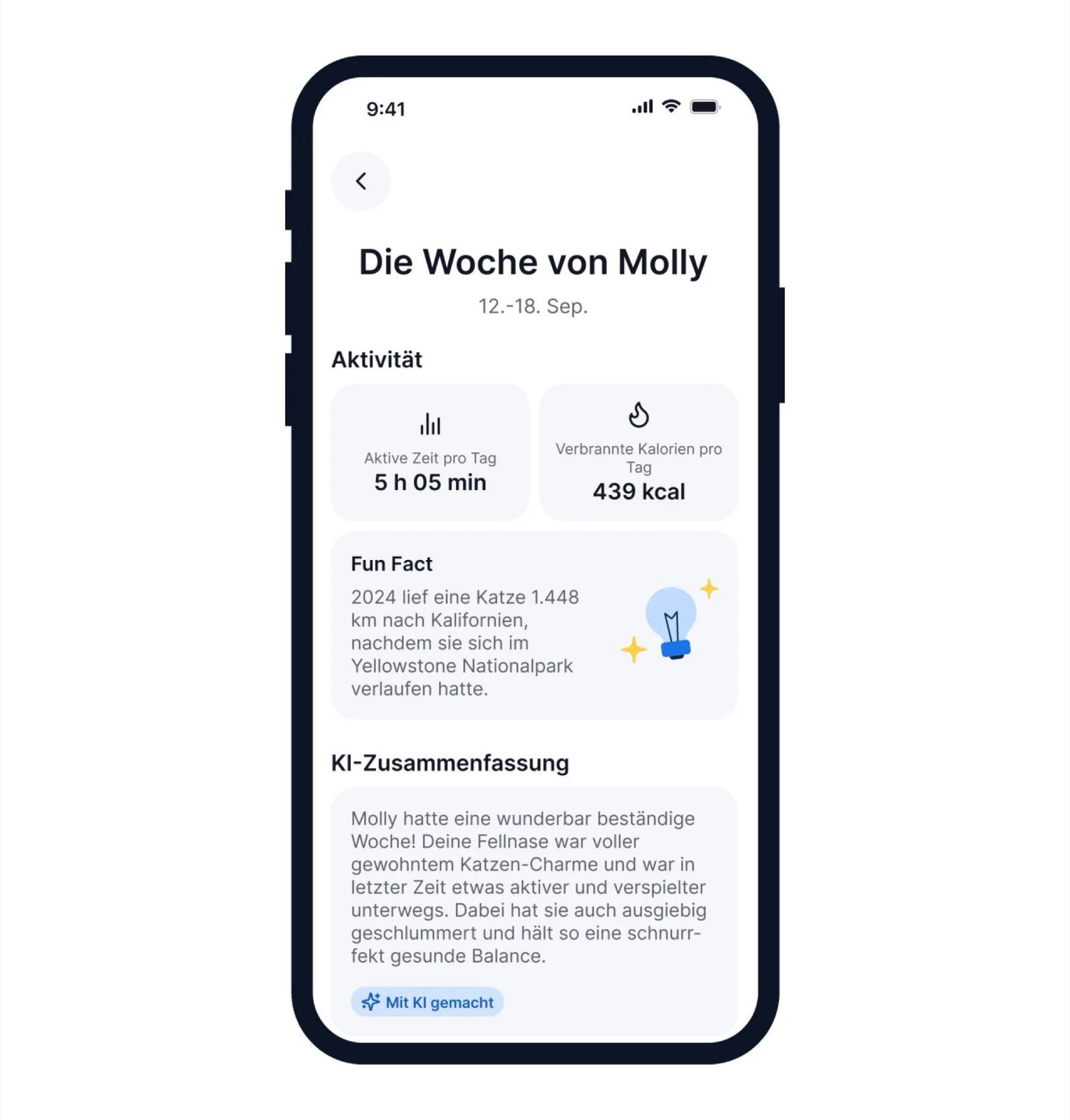 Os usuários podem configurar cercas virtuais no aplicativo correspondente para smartphones Android e para o iPhone Apple (US$ 775 na Amazon) para serem notificados quando o animal sair da área especificada. A distância percorrida pode ser visualizada em um mapa para ver o tamanho real do território do gato. LEDs e alto-falantes que podem ser ativados pelo smartphone facilitam a localização de um animal de estimação próximo