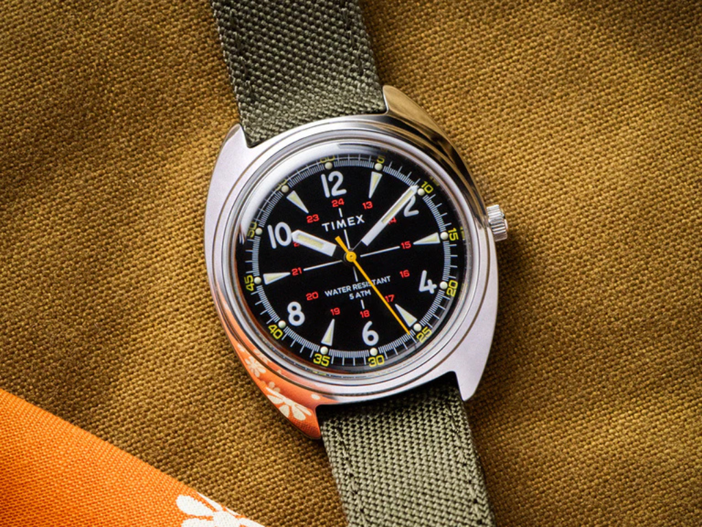 Timex e Bespoke Post reabasteceram seu relógio de campo de edição limitada, que foi lançado originalmente em abril de 2025. O relógio de quartzo de 36 mm é essencialmente uma reinterpretação do design do Timex Viscount dos anos 1970 https://www.vintagetimexwatches.com/c/viscount/com caixa em forma de barril de aço inoxidável, cristal acrílico abaulado para distorção vintage, ponteiros e marcadores luminosos, algarismos arábicos, trilha interna vermelha de 24 horas, marcadores de minutos amarelos e ponteiro de segundos laranja. Ele oferece resistência à água de 50 m e vem com uma pulseira de Cordura oliva de 18 mm com forro de couro e barras de mola de liberação rápida.