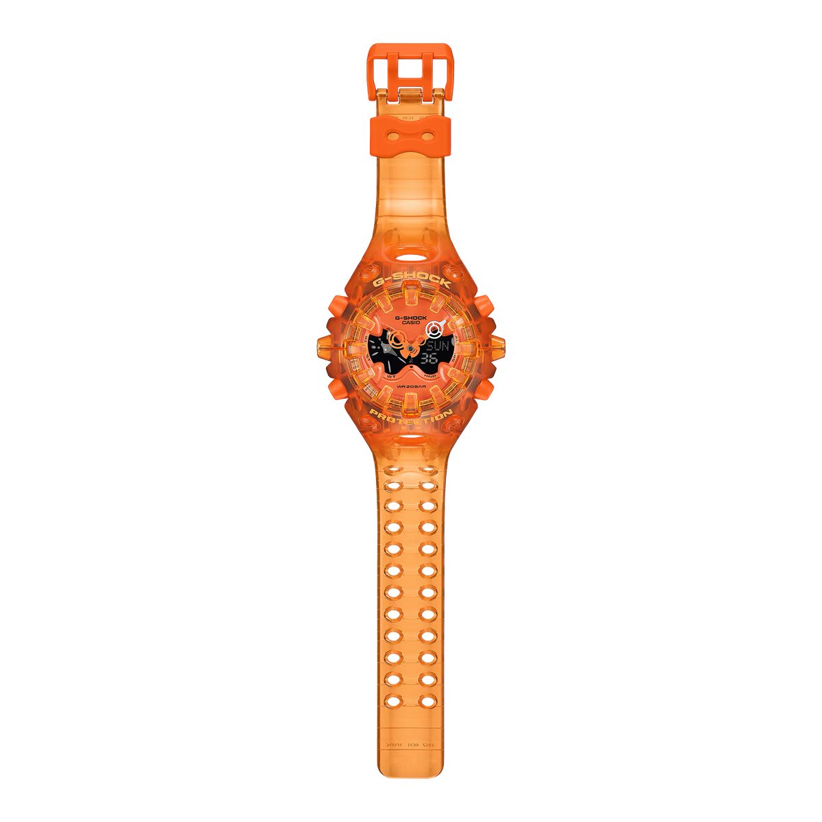 O Transparent Pack digital-analógico é composto pelo GA-V01SKE-3A (verde neon), GA-V01SKE-4A (laranja), GA-V01SKE-6A (roxo) e GA-V01SKE-8A (preto), com cada modelo apresentando um grande LCD invertido que lembra olhos alienígenas. A variante laranja do https://www.casio.com/jp/watches/gshock/product.GA-V01SKE-4A/ é a edição que se destaca aqui e aparentemente substitui o modelo prateado da linha originalque foi lançado pela primeira vez na China em fevereiro do ano passado.