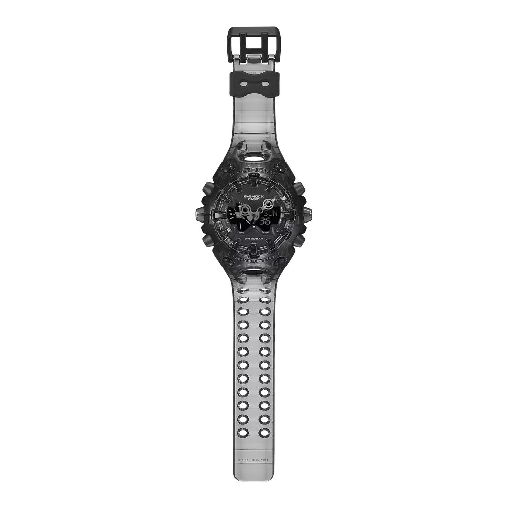 Apesar da transformação transparente, o GA-V01SKE não compromete a durabilidade e a robustez pelas quais o G-Shock é conhecido. Como os modelos originais, ele usa a mesma construção integrada de moldura e faixa para proteger o módulo central. Os enormes marcadores de horas 3D que pairam sobre o vidro também não são apenas para exibição, pois na verdade funcionam como um amortecedor para absorver impactos.