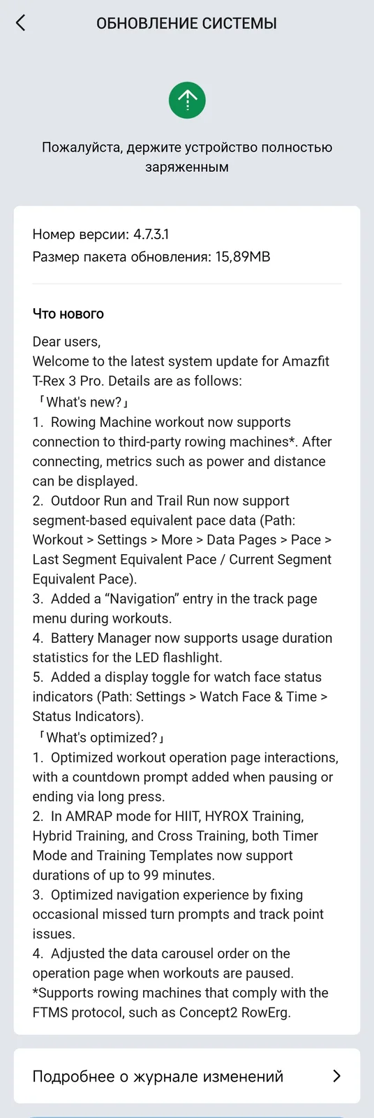 Com a versão de firmware 4.7.3.1, os usuários do T-Rex 3 Pro agora podem conectar uma máquina de remo de terceiros compatível com o FTMS ao smartwatch para coletar métricas de potência e distância durante os exercícios com a máquina de remo. Para atividades de Outdoor Run e Trail Run, agora é possível visualizar dados de ritmo equivalentes por segmento. No menu da página de acompanhamento do meio do treino, há uma nova seção de Navegação. Além disso, o Gerenciador de Bateria do smartwatch Amazfit agora pode exibir dados vinculados à lanterna LED integrada do wearable.