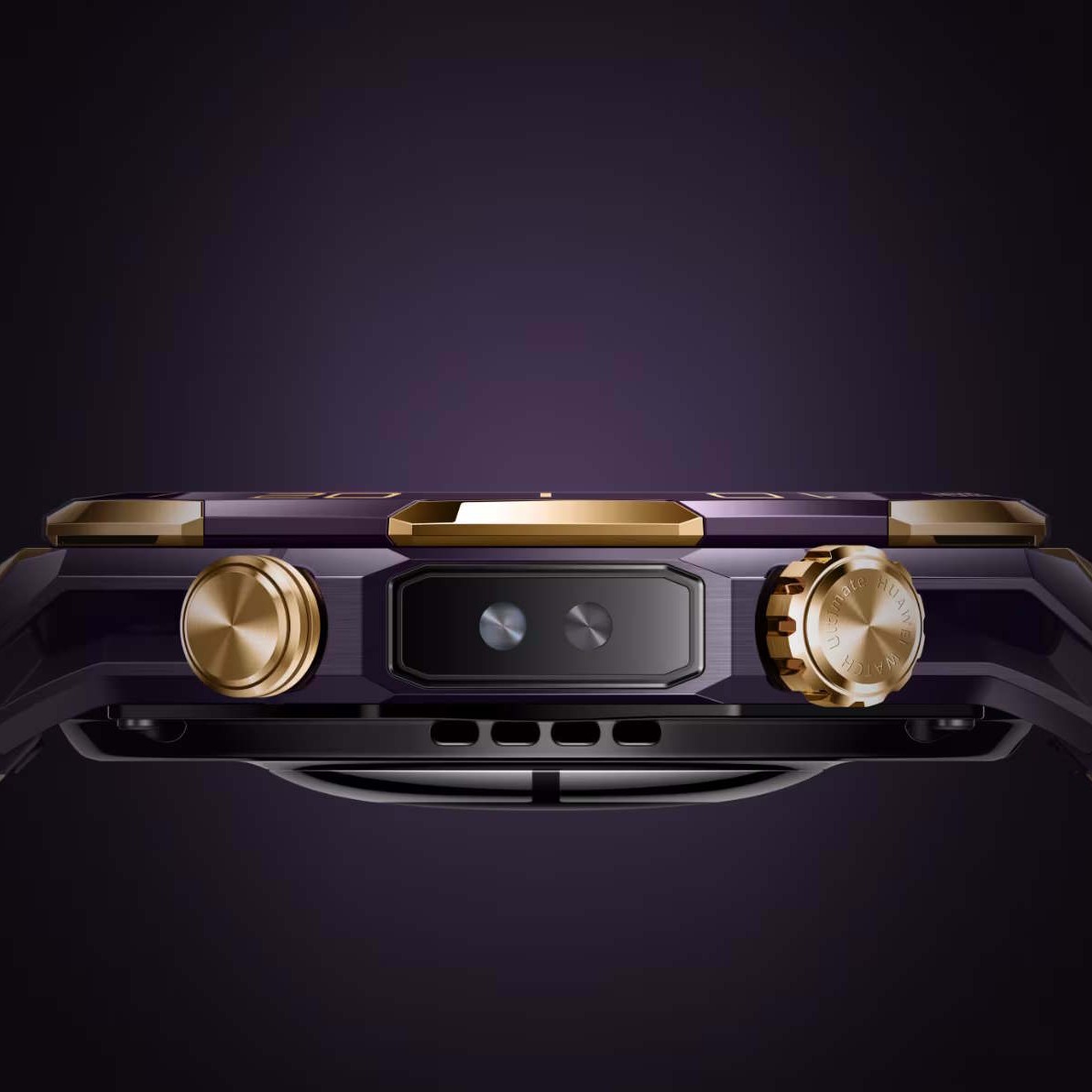 O Huawei Watch Ultimate Design Royal Gold tem um design roxo e dourado, com uma moldura de cerâmica com detalhes em ouro 18K e 24K. A caixa é feita de um metal líquido à base de zircônio, que se diz ser particularmente resistente, e a caixa oca ajuda a torná-lo mais leve. O relógio vem com uma pulseira durável de liga de titânio roxa e dourada, o mostrador é protegido por vidro de safira e a coroa também é revestida com ouro 18K.