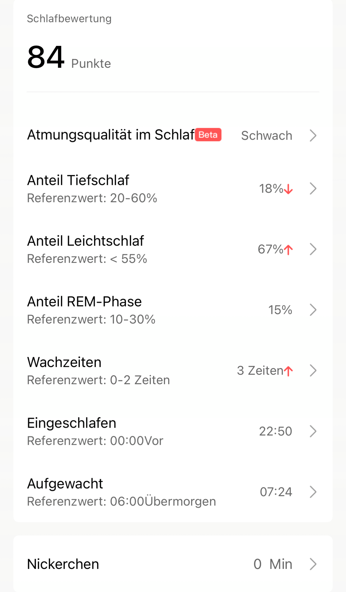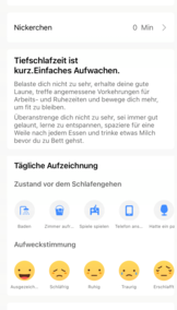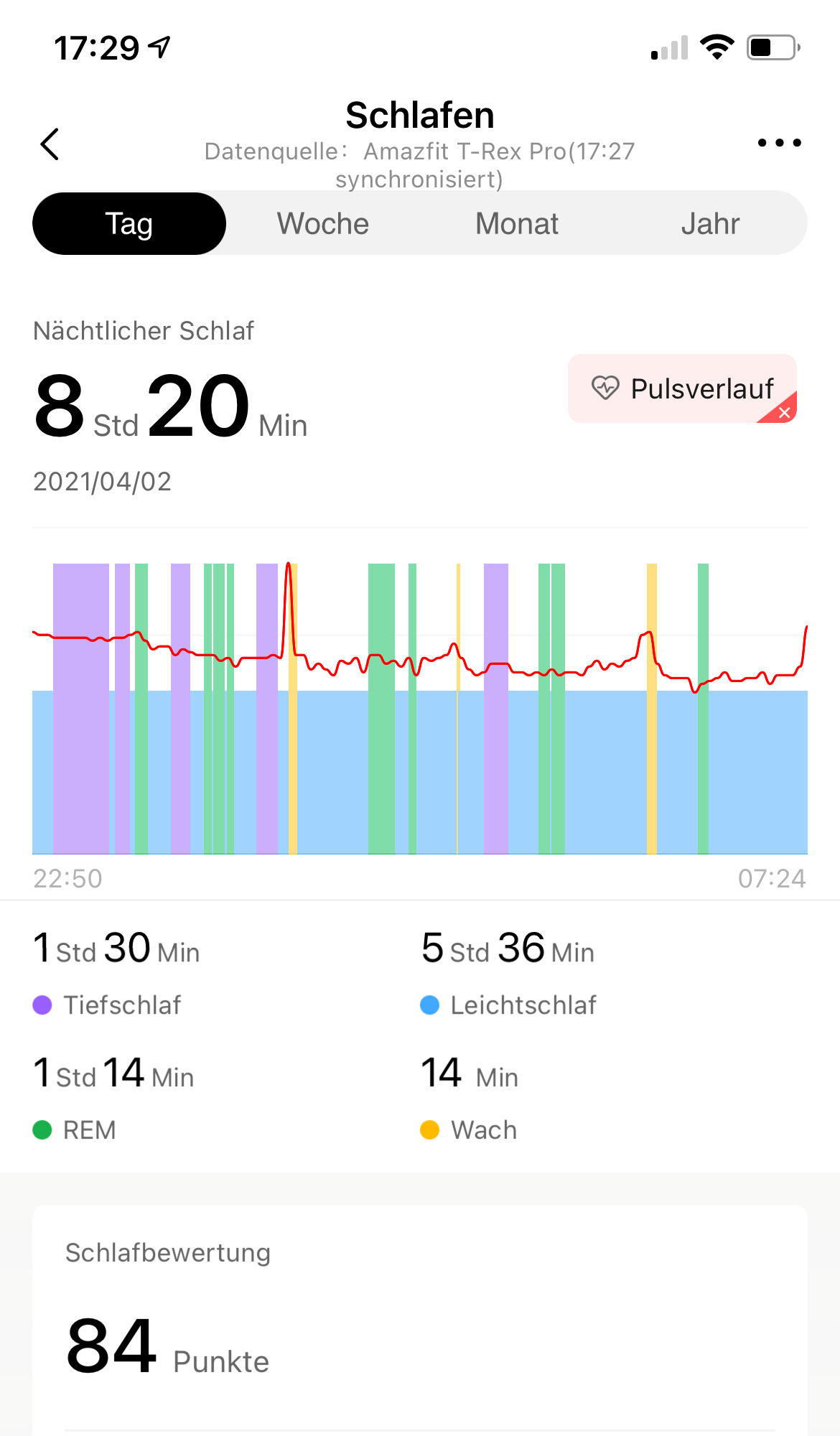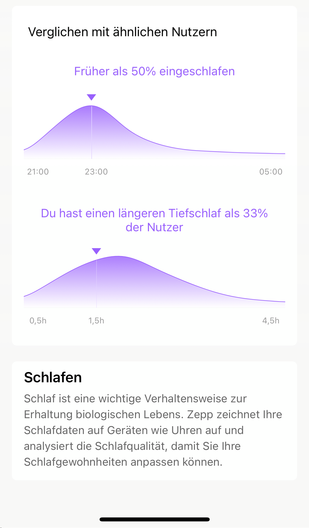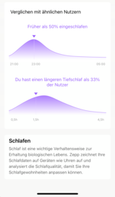 O Amazfit smartwatch registra tanto o sono noturno quanto uma soneca elétrica durante o dia. O registro do sono só pode ser visualizado no aplicativo. Ele avalia a qualidade do sono em geral e a relação proporcional das fases do sono. O Amazfit complementa o curso do ritmo cardíaco no registro das fases do sono, mas sem valores numéricos.