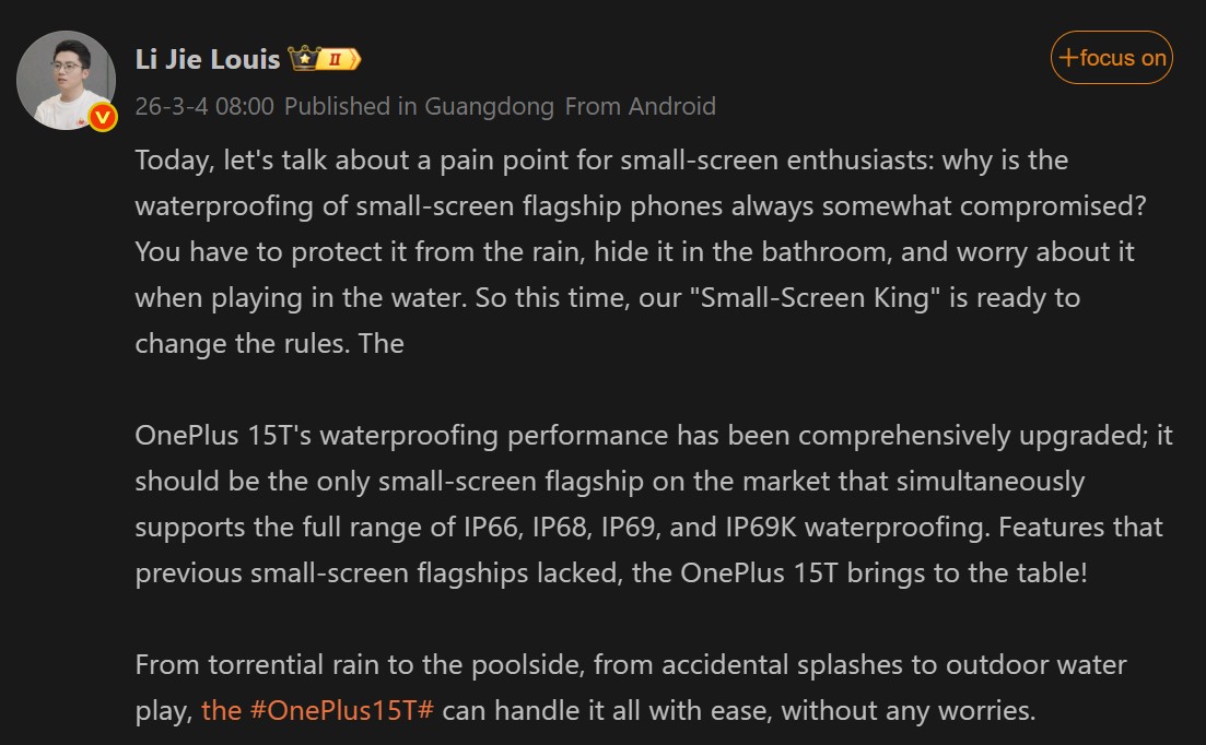 O próximo telefone Snapdragon 8 Elite Gen 5 está pronto para apresentar uma "gama completa" de classificações à prova d'água. No teaser, Louis menciona as classificações IP69K, IP69, IP68 e IP66. Essa seria uma atualização notável em relação ao carro-chefe da última geração, que tinha apenas uma classificação IP65, e essas classificações de proteção de entrada correspondem ao que o OnePlus 15 traz para a mesa (12/256GB atual. US$ 768,87 na TradingShenzhen).