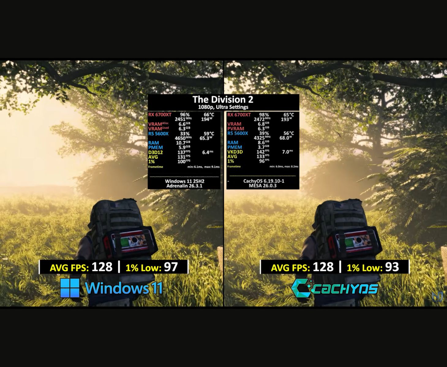 No entanto, o Windows 11 fechou a lacuna em jogos como The First Descendant em configurações Ultra de 1080p com FSR 3 Native, onde executou o jogo a 63 FPS, enquanto o CachyOS conseguiu apenas 54 FPS. Ao executar o The Division 2 em 1080p Ultra, tanto o Windows 11 quanto o CachyOS atingiram 128 FPS, com o Windows 11 apresentando melhores 1% de lows a 97 FPS em comparação com 93 FPS no CachyOS.