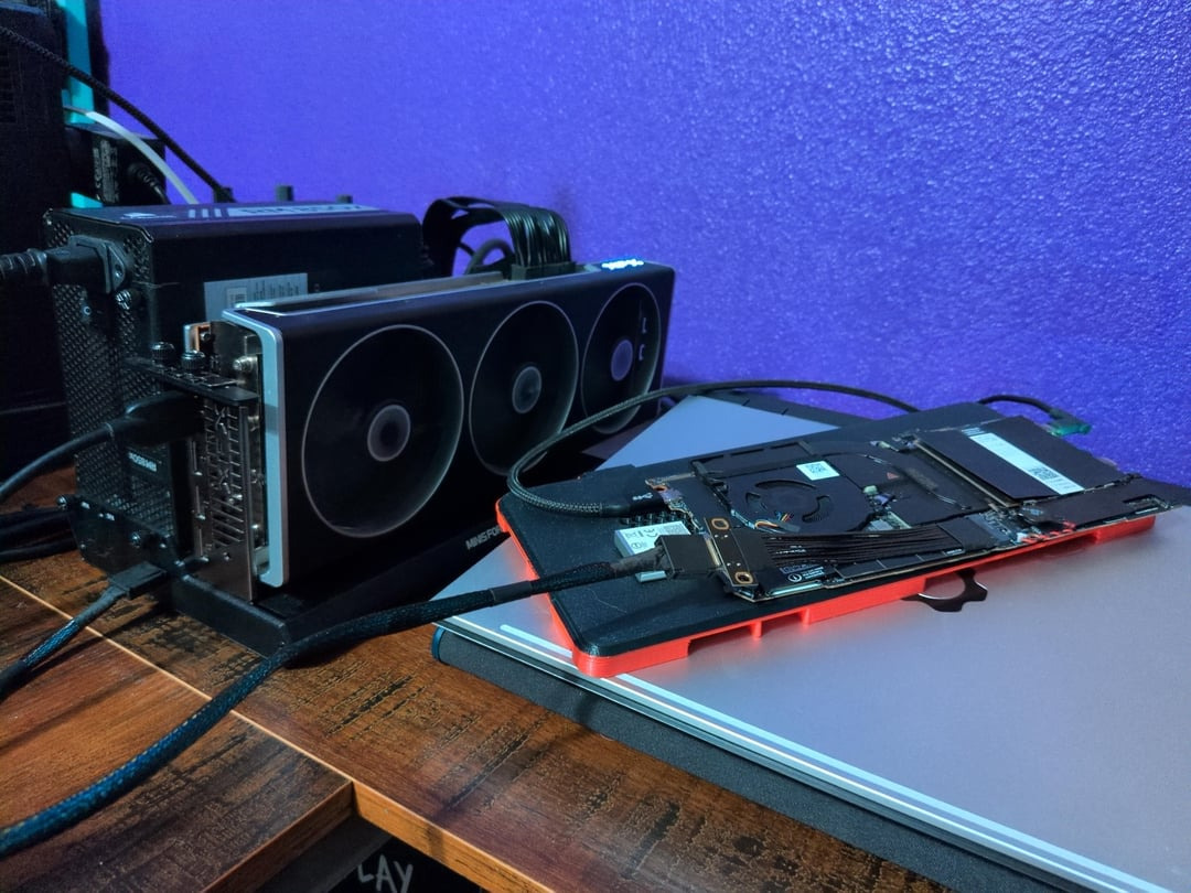 O registro de construção também mostra algumas peculiaridades do mundo real, como limitações de largura de banda em placas-mãe antigas de 12ª geração em comparação com as de geração atual, os desafios de trabalhar com filamentos PETG e ASA para resistência ao calor e a importância do ajuste fino do fluxo de ar para resfriamento. O usuário documentou cuidadosamente todas as etapas (confira as primeiras compilações aqui e aqui), desde o ajuste do firmware e do resfriamento da placa-mãe até a garantia de que o gabinete da eGPU mantenha o monstruoso 7900XTX sob controle.